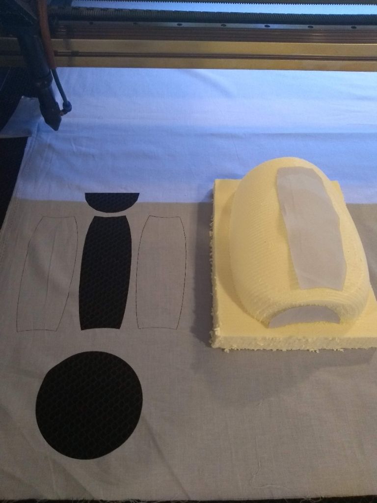 On tuesday may 29 I cutted the pieces of fabric with the laser cutter. I chose a light grey 100% cotton piece of fabric. (I actually took the board with the LEDs to the fabric shop and held it under different pieces of fabric.) I transfered my files to the laser cutter computer. When I imported the file, I allready suspected the pieces where too small. I decided to just go ahead and cut them. I used 40 for speed and 40 for power. the cutting went fine, but indeed the pieces where way too small. I suspect this has something to do with first saving the file to PDF and then making a DXF or AI CS2 file of it. I didn't want to first change my files and then cut again. What I did was measuring the lenght of the cell body mold and measured the edge of the fabric. It came out that the scaling factor was 1,27. So I just multiplied the size of the pieces with 1,27 in the laser cutter software. After cutting I still thought it was a bit tight. The factor 1,35 worked out great. This was for the 4-pieces design. for the 5-pieces design I had to use a factor of 1,40. I want to use 3 layers of fabric, so for each design a cut 4 sets. This way I had one emergency-set for every design.
