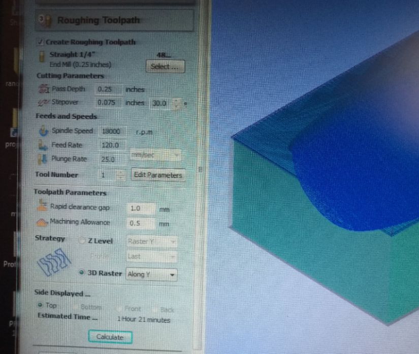 - For the roughening toolpath I chose an 1/4 inch end mill. It was the only choice I had. My model is allmost 8 cm deep, so I have to use a 10cm tool. /the only ones of that size where 1/4 inch. The settings you can see in the pictures below