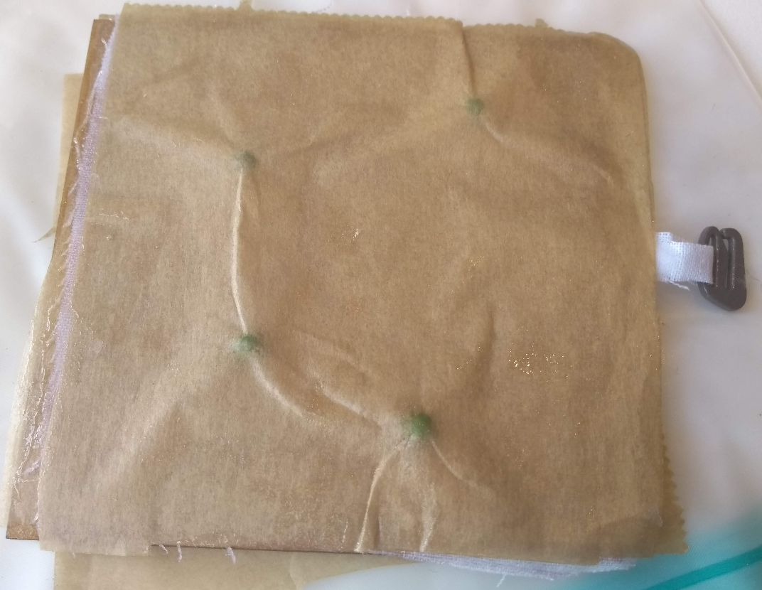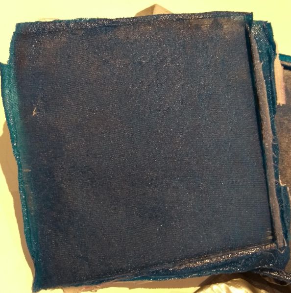 I don't want my cell to have the rough look that the burlap gives it that is available in the De Waag. So I brought my own testing fabric; white and blue left over cotton. The epoxy I used was Tarbender. You can find the data sheet here. Also I wanted to experiment with embedding beads that can be the ion channels on the cel membrane. First I laser cutted some more 10x10 cm mdf squares that could serve as a mold. The fabric was also cut in the same dimensions. At last I also cut baking paper in 10x10cm. Then I prepared the table for casting. The table was close to the window, so toxic fumes where diluted. I covered the table with waste bags that I sticked together with duct tape. On the table I put: