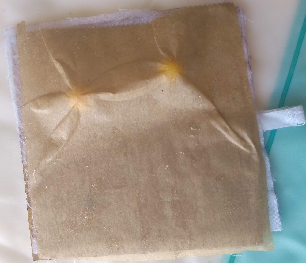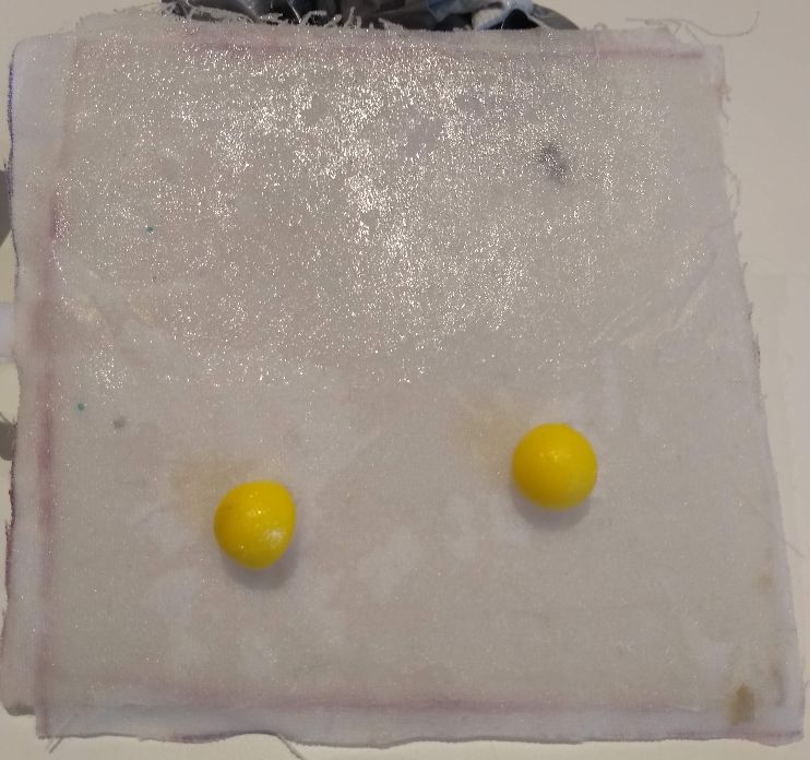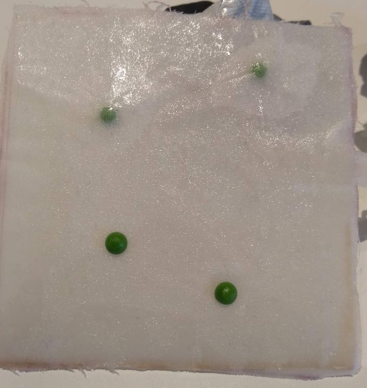 When I had everything ready on the table I put on gloves and took the two jars for the resin to the flow cabinet. I put on a gas mask and started mixing the two components. The ratio had to be 100:41 by weight. First I shook both jars vigouresly for a full minute, as was stated by the description. Then I poured part A in the bigger mixing container. When Emma demonstrated the mixing of the components, we noticed that part A was very viscous. When you have to cast it to another container, it leaves a lot of fluid on the edges. I casted part B in a smaller seperate container and after eaching 41 grams poured it to part B. After that I mixed the two with a mdf left over piece. I put all my waste in the back of the flow cabinet and carried the resn mix to my working table. There I placed a first piece of textile and soaked it in resin using a brush.When it was saoked I put on another piece and repeated. On the top I placed several beads to test if they would hold. I had two kinds of beads that I attached in a few diffeent ways; underneath one layer of textiles, just on top of the textile and more or less embedded in wholes in the textile. Also I tested clips that I might used for the closing of the two halves of the cell body.