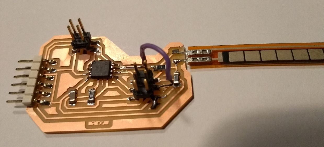 Then I wanted to test input and output on both boards. So I programmed my bridge board with my previous "serial stretch" code, that I used in the Input Devices Week (11) and the Interface and application Programming Week (13). I changed all the corresponding pins. Also in the Arduino software I changed attiny45 to attiny85. When I opened the serial monitor, it gave me a value around 860 and no matter how I bended the flex sensor, the value wouldn't change. I measured the resistance on this flex sensor before soldering it to my board, just to decide what value of resistor I had to put on my board. Then I measured values in between 8000 and 16000 Ohm. When Emma helped me out, she measured a short on my stretch sensor, but we couldn't actually see what was making the short. I took of the stretch sensor. Nothing strange to see underneath the sensor though. When i tried to connect the board to my FTDI header again to see what values my board was spitting out now, without a sensor, I wrecked the FTDI header. It came off, copper and all! Now there was no way for me to test my output on this board. So I decided to use my stretch sensor input board from week 11 as a bridge.