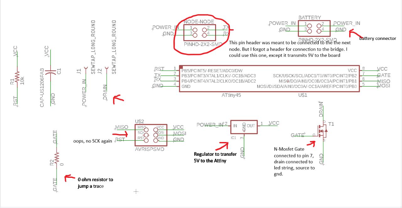 On my node board I also made two mistakes. The first one is like the bridge board; no SCK connection between the ISP header and the attiny85. So i soldered a wire again. The second mistake I made is that I added a 2x2 header for connection to the next board, but no header for a connection to the bridge. I could use the node-node connector, except that it would then transmit 9v (POWER_IN) to the bridge board. I will have to use jumper wires again to solve this. On the picture on the right you also see a string of LED beads I designed.