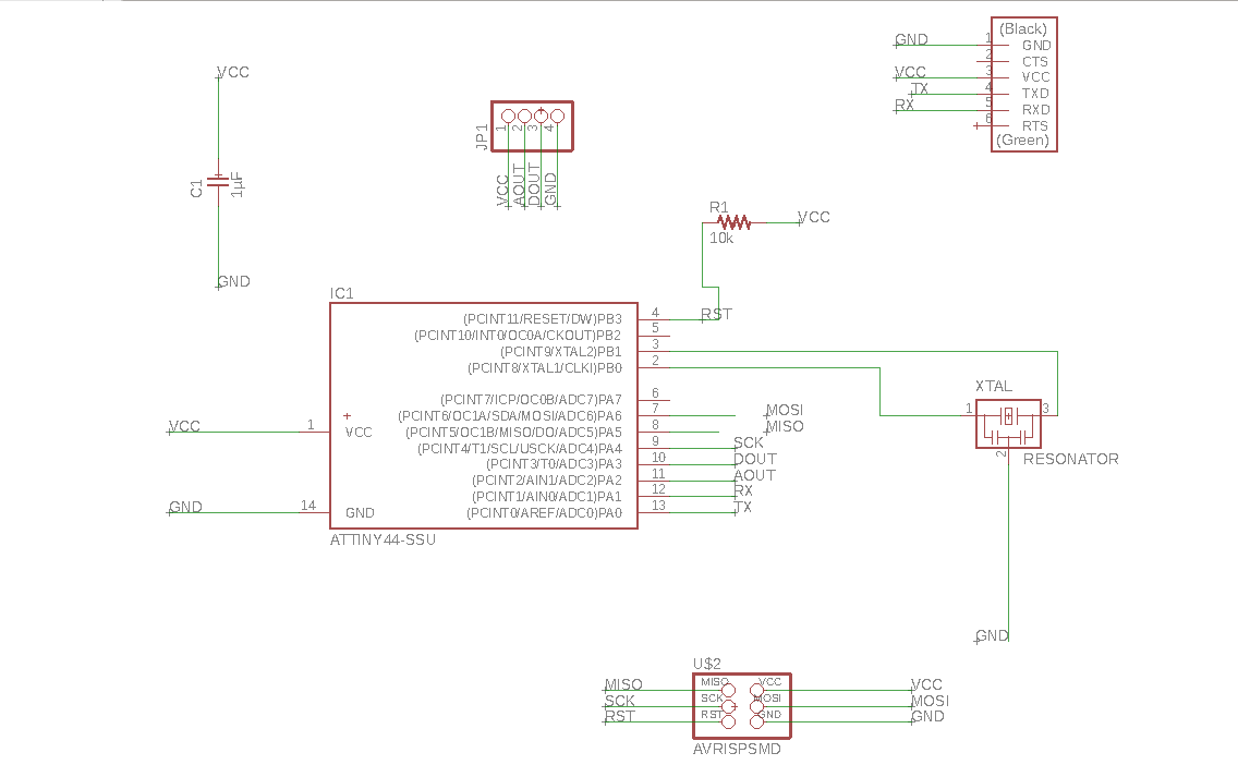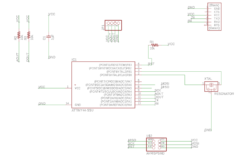 In Eagle, I design the schematic easily. I just have to connect analog and digital output (here, 10 and 11) to the Attiny85: