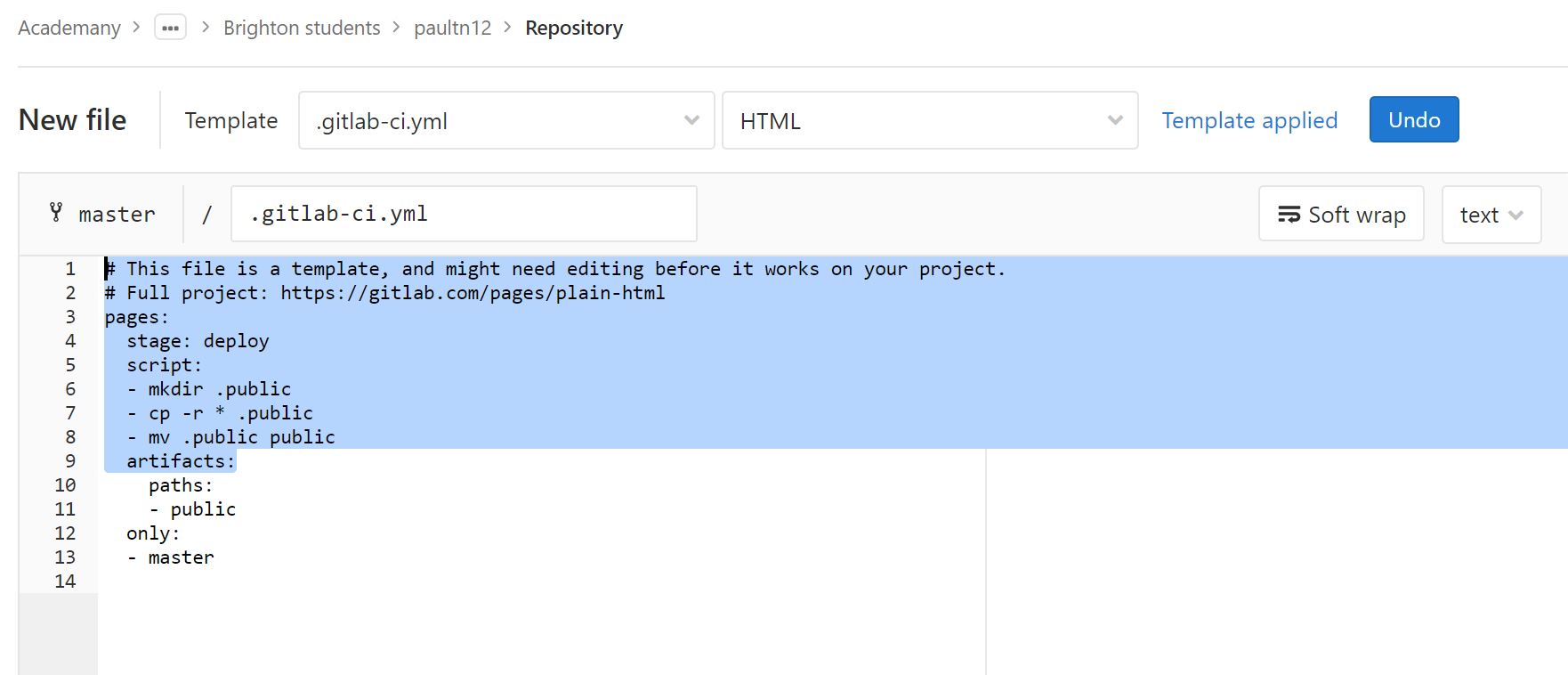 I also need to make sure I have a runner, which basically tells my git to run a certain type of language. For this I need to create a .gitlab-ci.yml file telling Git to run the code in the repository as an HTML.