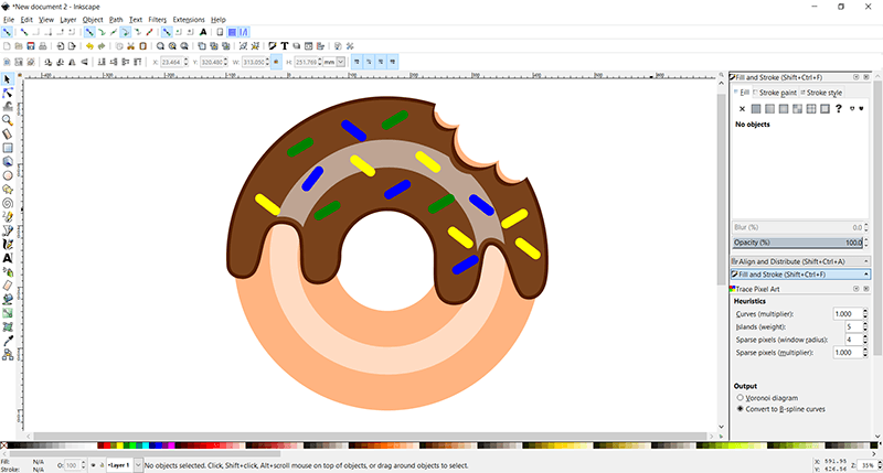 I decided to try out Inkscape for my 2D CAD as it works on any operating system, is free and open-source. You can download it here. It allows you to create vector files similar to adobe illustrator. I followed these two tutorials and made a doughnut which introduced me to lots of interesting tools and capabilities of the program.