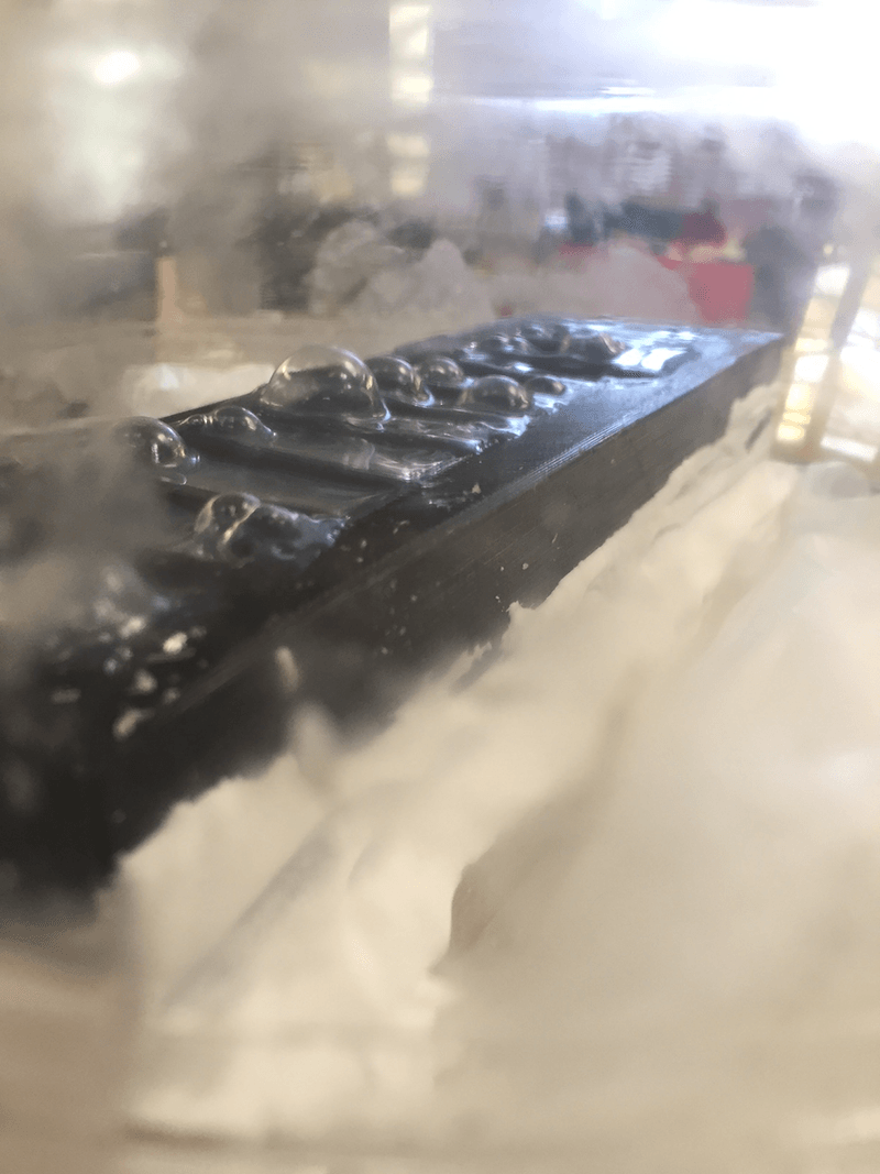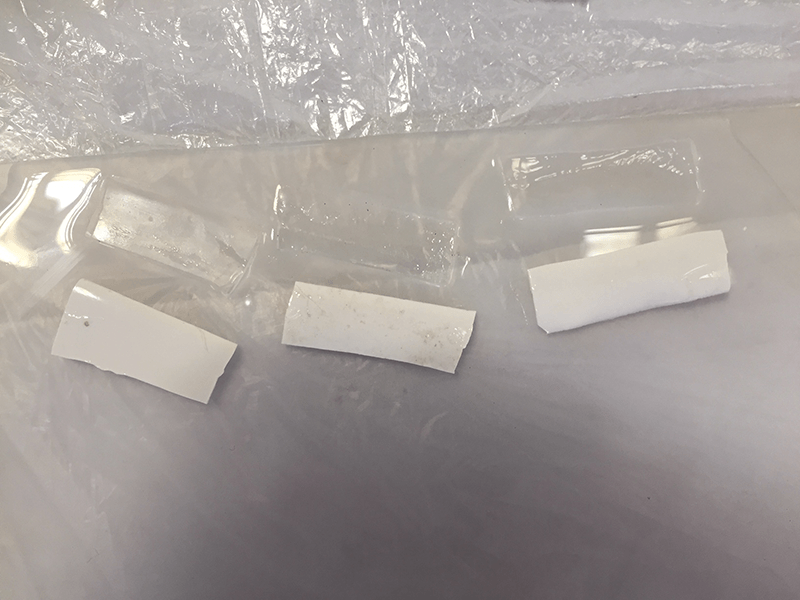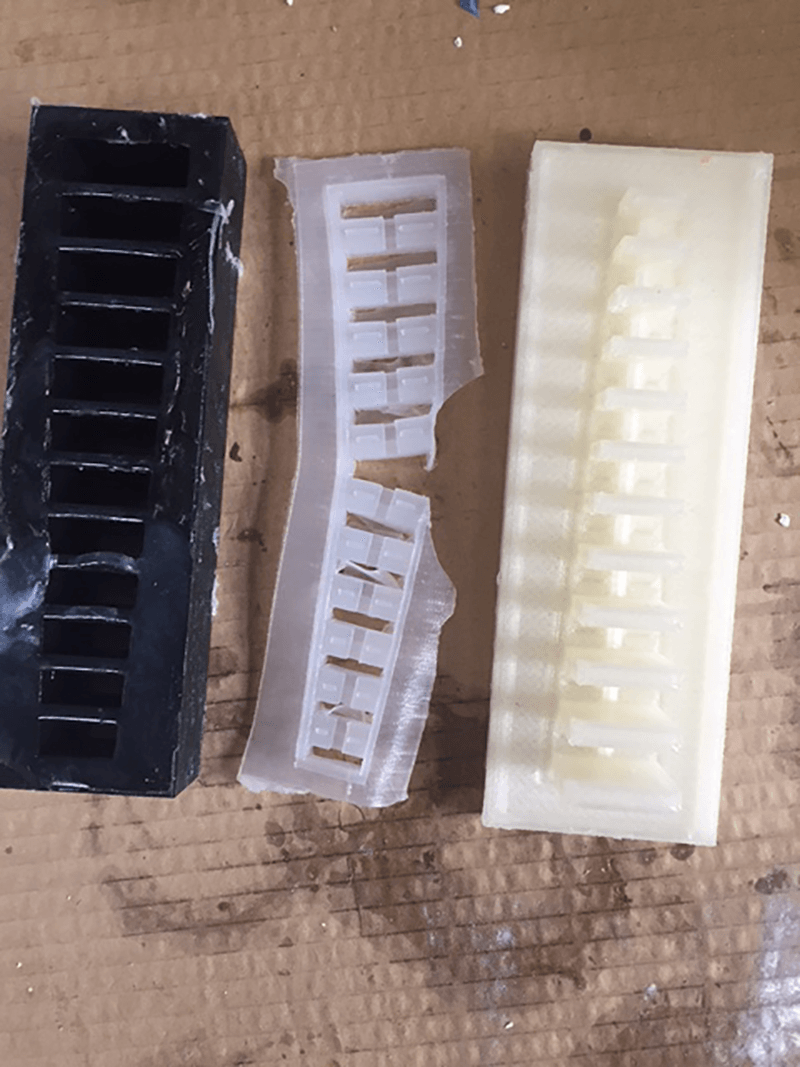 I did some tests using samples of the silicon I used for the mold with the aim of creating a physical barrier between the silicon and the Ecoflex. I left one bare, one covered in clear spray paint and one covered in hair spray (that we had been using for 3D printing) and left them out to dry. After this I mixed a small amount of Eco-flex and placed each of the 3 samples on.