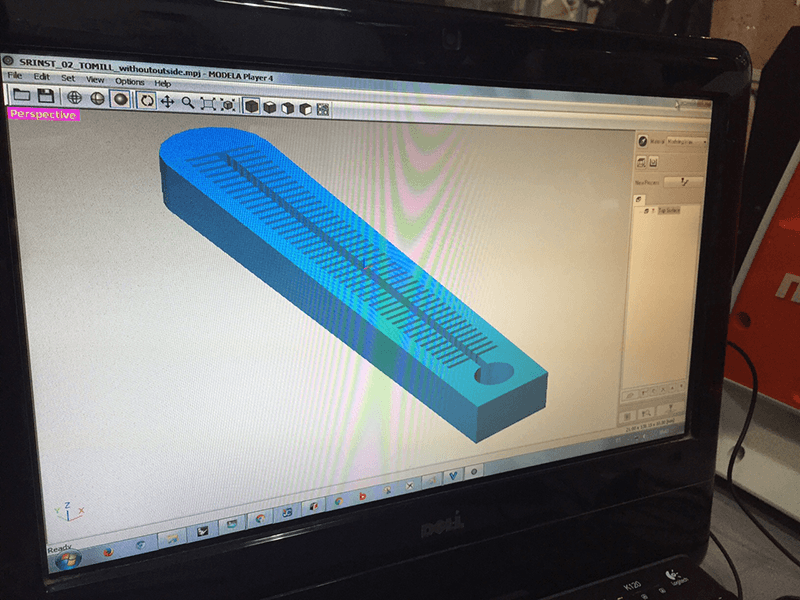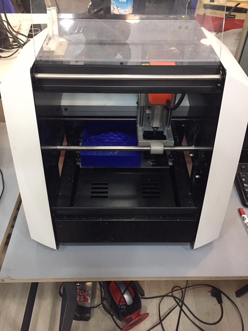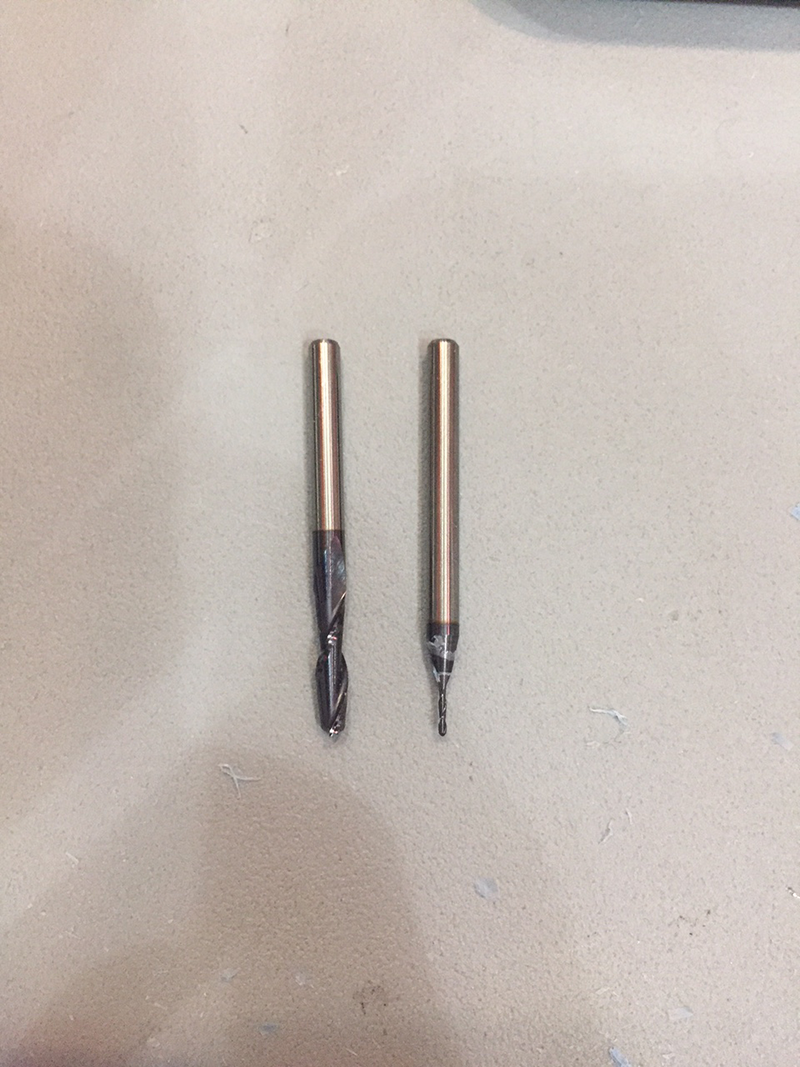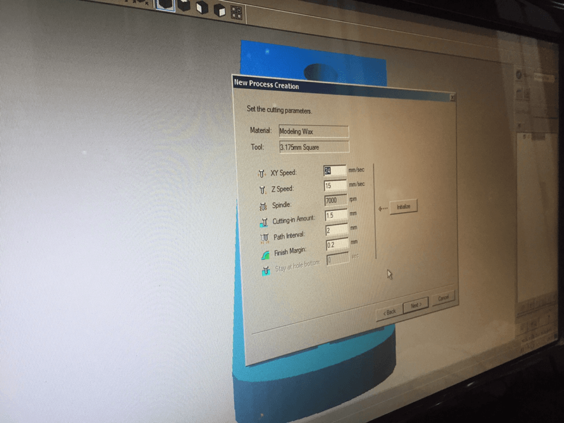I used the Roland mill, but used a larger drill bit (3mm) at first to remove unnecessary material first (roughing) and then down to a 0.79mm drill bit (finishing) to achieve the detail. I was introduced to a new program called MODELA to create the gcode for the file. This had preset feeds and speeds for the wax material being cut.