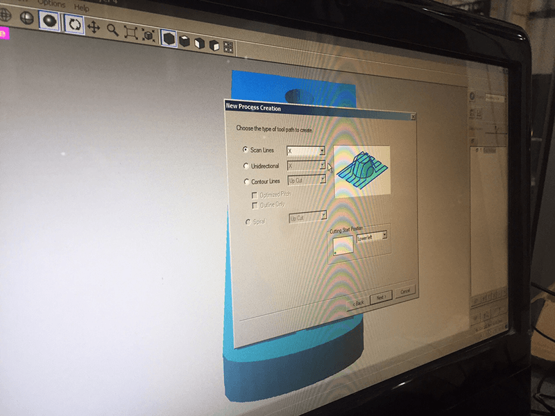 As my 3D model did not have any sloped edges I deicded to pick 'scan lines' in the x direction (as opposed to contour which would trace the edge). Due to the orientation of the model, this would give the least amount of travel time, or more importantly the fastest cut time.