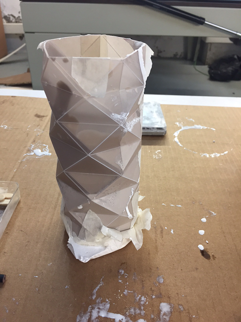 I liked the shape I got, but I wanted it a little bigger to make a planter with it, so I cut a piece with a larger pattern and folded it up. I sealed one end with lots of masking tape and used MarbleCast as the material. I could not find much safety information on this material at all which I found unusual. The mixing ratio was approximately 4:1 with water with about 10minute working time and 30 minute hardening time.