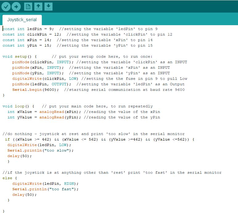 I uploaded a simple blink code using the Arduino IDE to test it was working. Next I severley edited my joystick code from last year to give me a HIGH LED value whenever the Joystick was moved from rest.