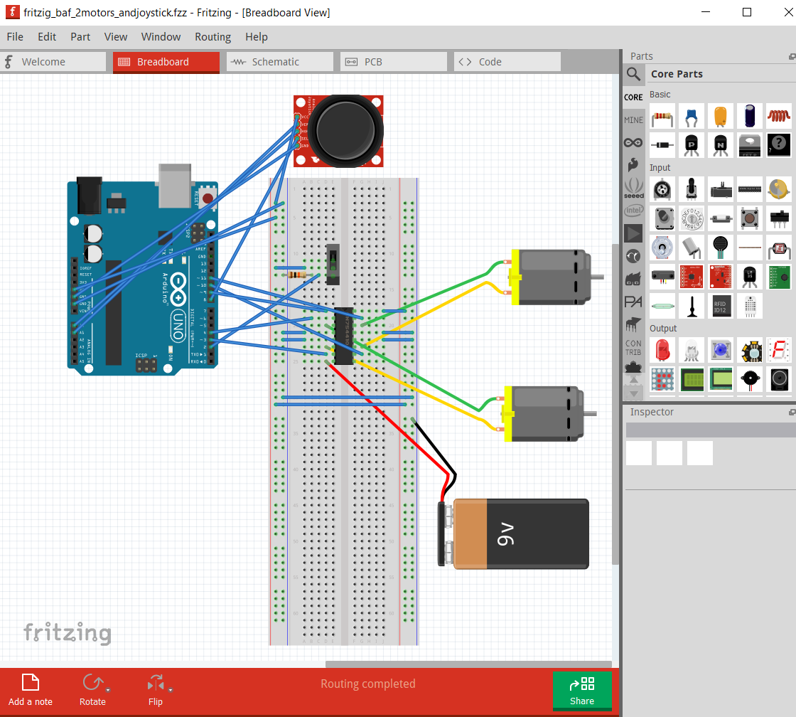 I got all wired up, using four LEDs to indicate the left and right motor and their direction. My first iteration of code unfortunately did not work. Even after recieving some help on the structure of 'IF' statements and analog/digital output. I eventually found out that my issue was with how arduino works out its mathematics. I was using integer maths and my calculations were always being 'truncated' to zero which meant my robot was going nowhere. After some online forum help I used 'float' maths that simply meant I had to add a '.0' to some of my numbers. I researched this further and ideally 'float' maths should be avoided as it takes much longer, but for my simple sums the delay is unnoticable. I need to continue to research, but it can be avoided by using large numbers and being happy with approximations.