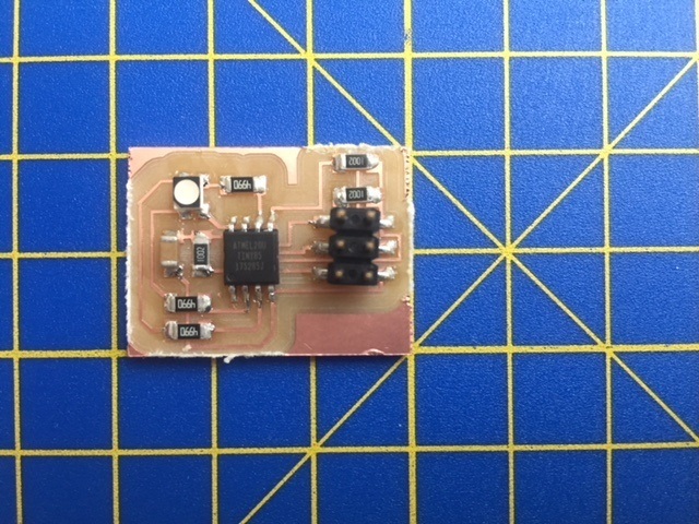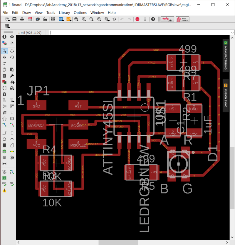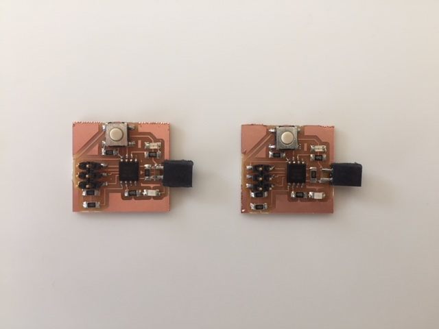 But first to mill the boards. I created a master 368P-AU with an LDR and a Tiny85 with a RGB LED. The aim of this is to control the intensity and colour of the RGBLED on multiple 'slaves' based on the light levels around the 'master'