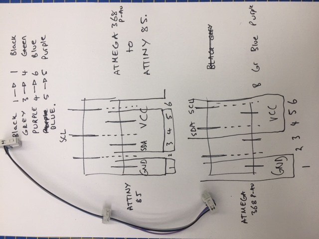 The AT MEGA 368 P-AU has I2C interface built in, however the ATTINY 85 does not. The 85 has Universal Serial Interface (USI), but this can be used to facilitate I2C and SPI communication. Fortunately there are libraries available to handle this; TinyWireS is the library I will be using.