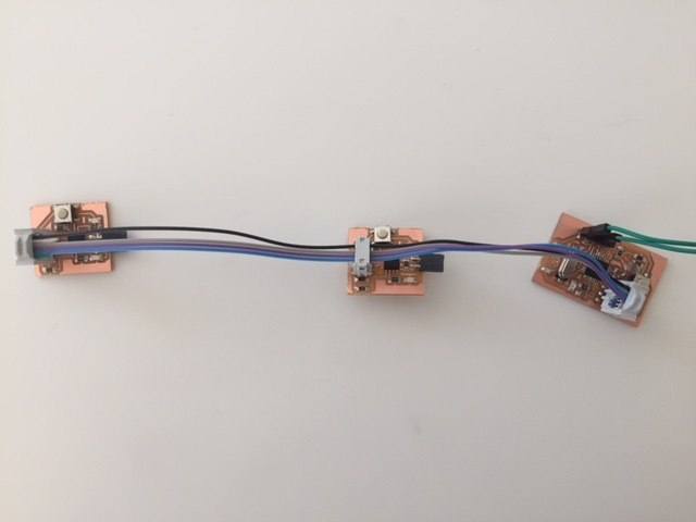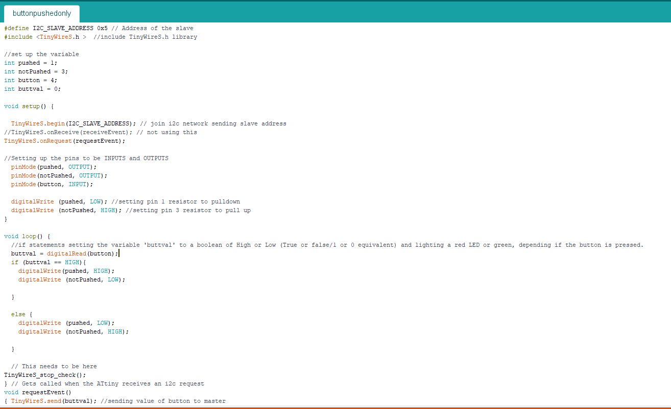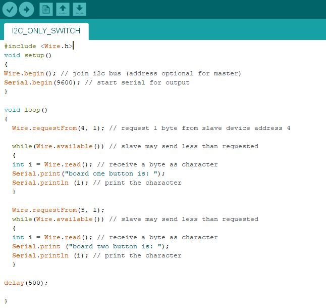This led me to thinking that it actually makes a lot of sense to have the information going from MASTER to SlAVE, with this it is possible to have many sensors connected to only on pin on the MASTER board. For my final roject I will require at least one limit switch st every axis to set the zero and stop the robot crashing into itself. Instead of taking up 7+ pins for each switch I can create and I2C circuit to control all of them using just the SDA and SCL pins. So I took a quick detour as I wasnt getting very far... see below to find the new boards I made with multiple slave switches telling the Pauduino wether they were on or off.