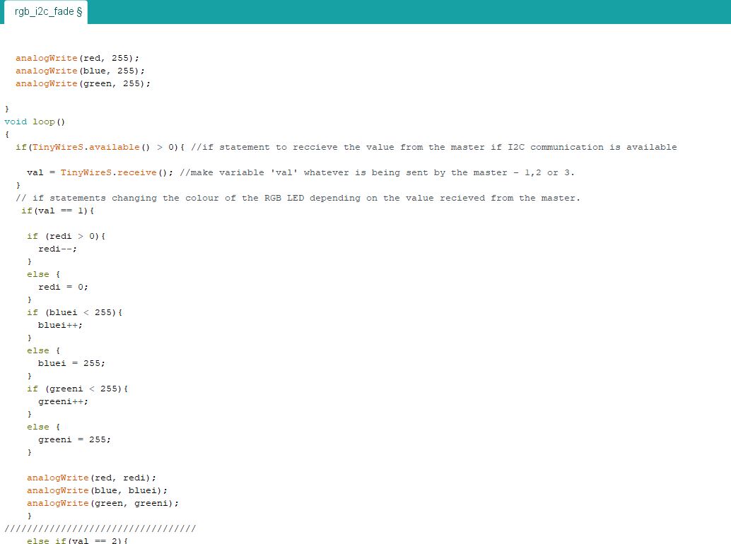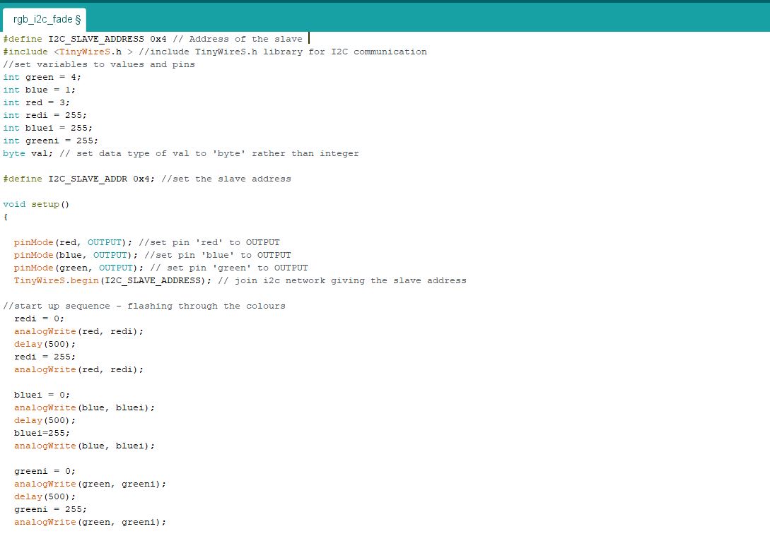 here is another link that has info on the TinyWireS.h library.This was good as I could see both boards were working and I was capable of I2C communication, however I needed information going the other way with my LDR controlling my RGB LED.