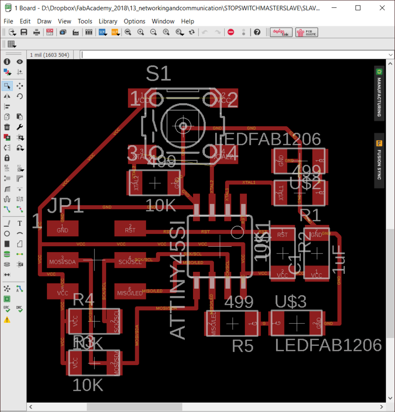 As stated above, I will need many limit switches, at least on for each axis of my robotic arm. To avoid using countless pins I can connect these all in a network using I2C. I modified my RGBSLAVE board to create a board with a switch and 2 LEDs to indicate if the button was pressed or not. I also edited the files so I could mill multiple boards at the same time which will save on wasted time changing tools.