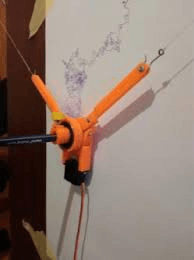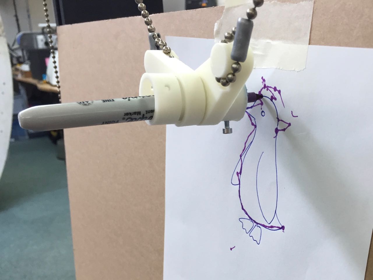 It was the third design here that proved to be the star. Printed on a robox using automaker (with cura algorithm) for slicing allowed this piece to be printed in one and have moving parts. It was very exciting to remove the supports and slowly reveal the rotation achieved. We had a test draw, moving the cables by hand trying to follow, what else, but a picture of a penguin.