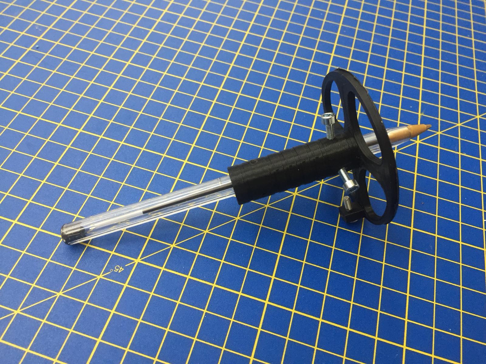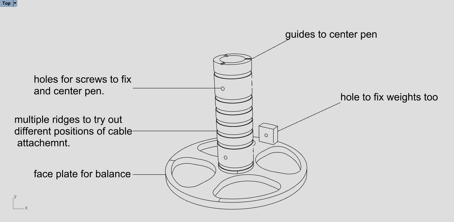 Attaching the pen will require a central hole with three thumb screws to center. This will allow for different pen thicknesses and ease of removal. The surface will also be important in designing the gondola, vertical or sloping? Vertical will allow for more accurate drawings over the whole surface, but it will be harder to calibrate and will depend on the sprocket-wall distance
