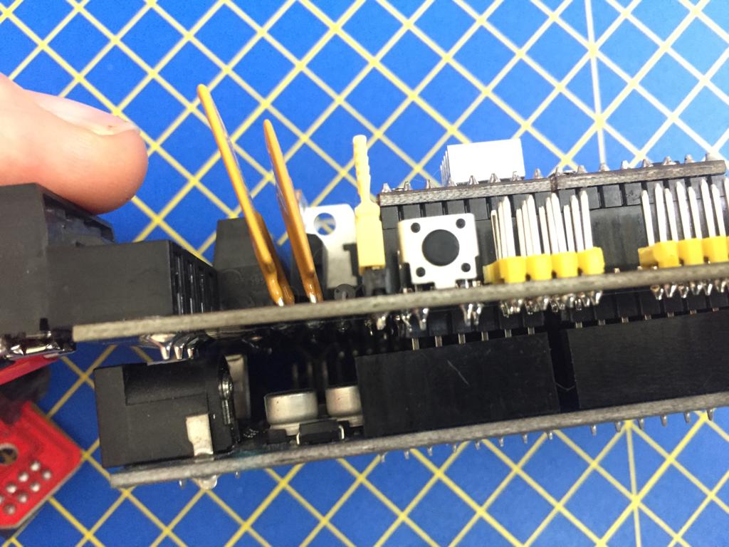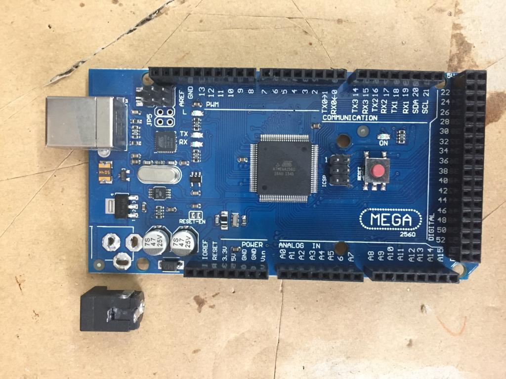 We removed the barrel connector from the Mega as it seemed to be getting in the way of the RAMPS fitting properly on the Mega board.
