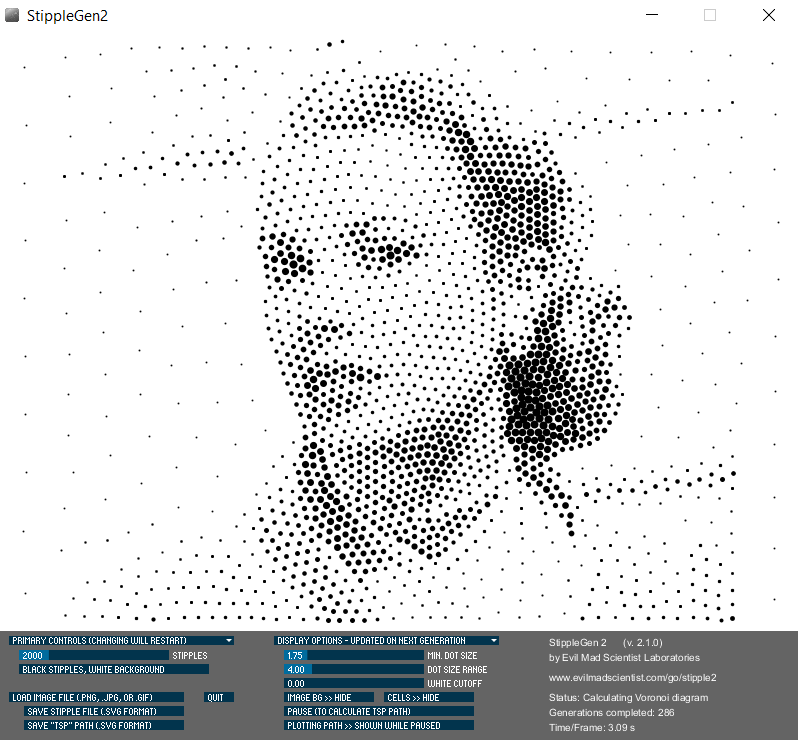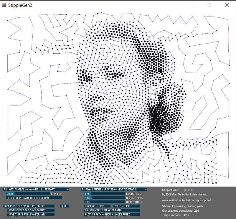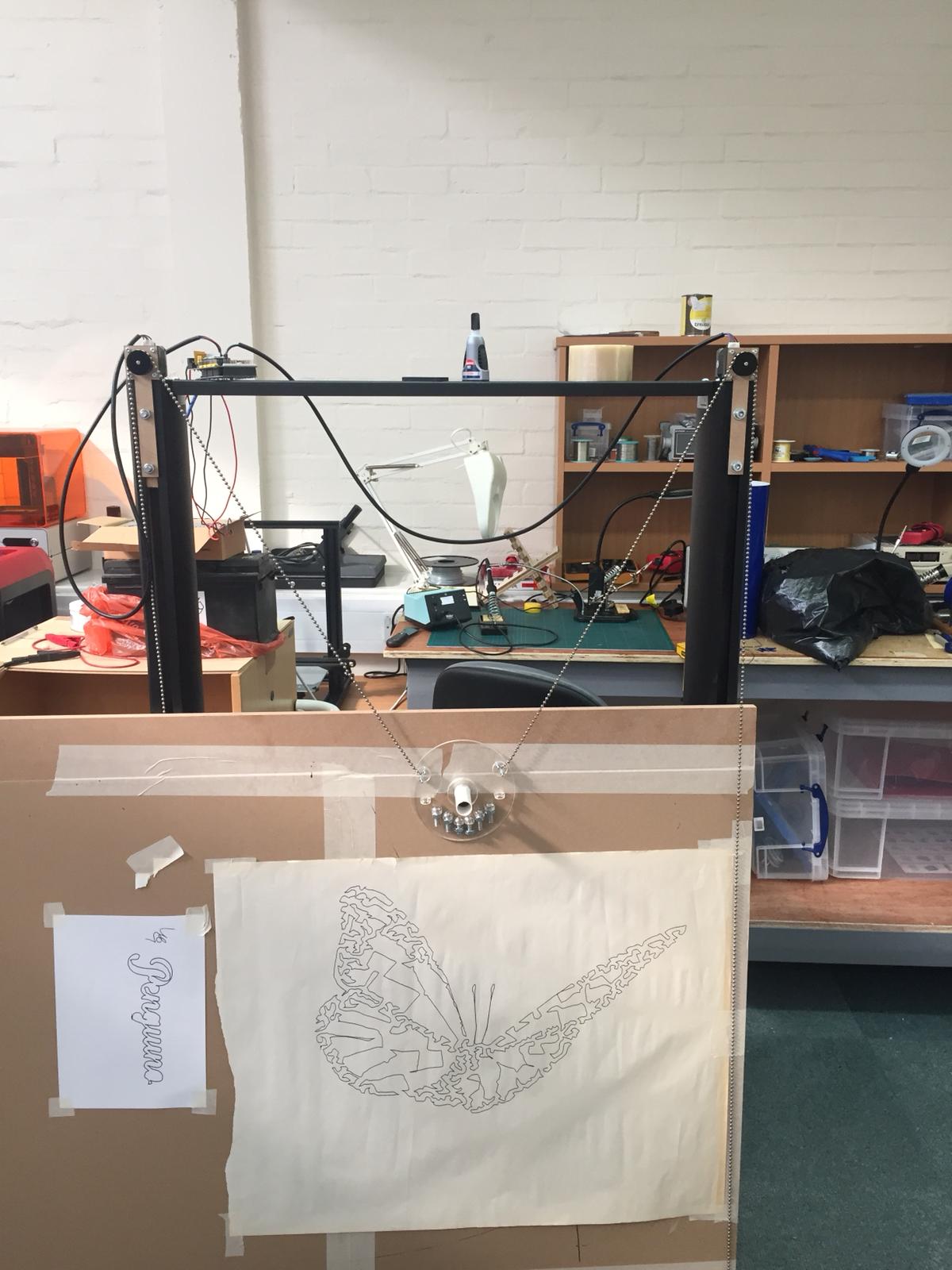 The limitations of our machine meant we could only draw a single continuous line. We created a few test files to measure accuracy, repeatability and if any accumulated errors were in our file, but all the drawings were pretty simple. We found a program called Stipple gen 2. This program takes an image, applies points based on grayscale, from this a voronoi diagram is created which then creates a new set of points and subsequent iterations refine the distribution. From this it is possible within stipple gen to run a Tradesperson shortest path or ‘TSP’ algorithm which creates a single line across all the points (in theory in the shortest path) This is how we created the butterfly picture below.And finally some videos and images of the machine in action showing what we can produce. The "First Circle" was the proudest moment.