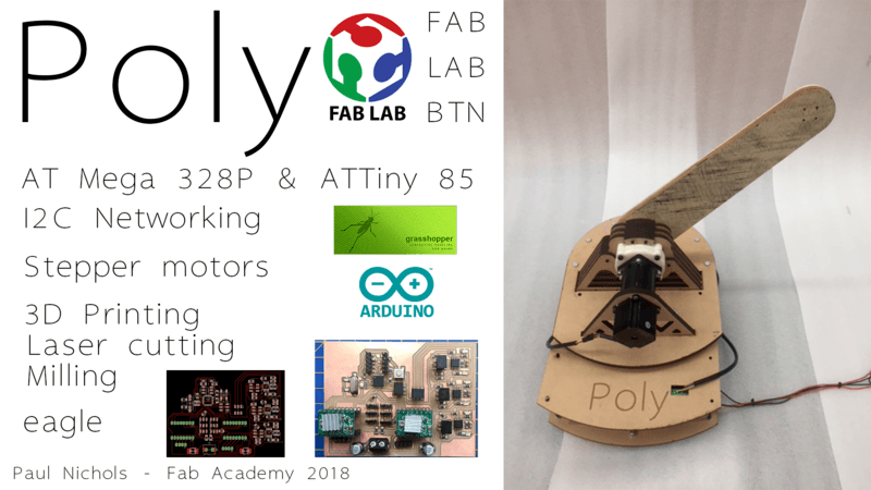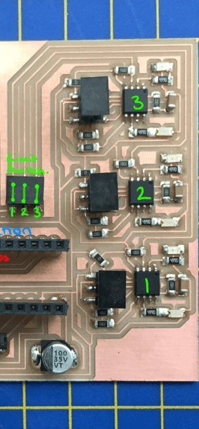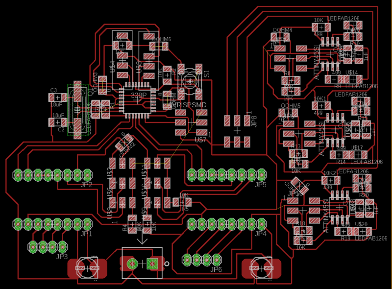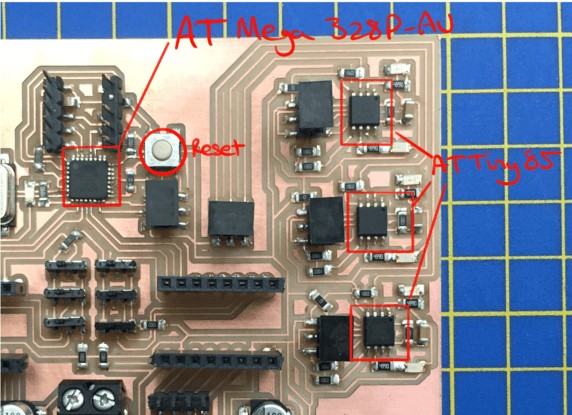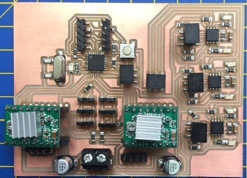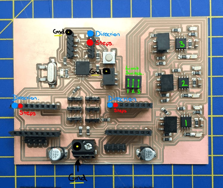 Having managed to create my own version of an Arduino this year, I used that for the final board. For each of the drivers/axis of my robot I only need 2 pins to send the information for the number of steps and the direction of the stepper motors, so with an Arduino, I can in theory drive up to 10 motors, which would be more than enough for every axis I require. Of course I need other pins for different functions, so I may need to upgrade my board as this develops.