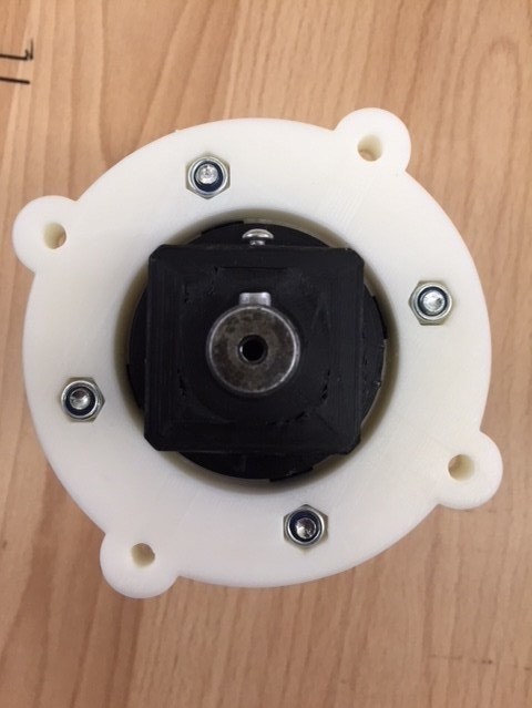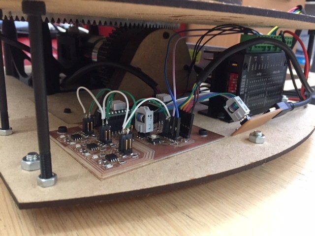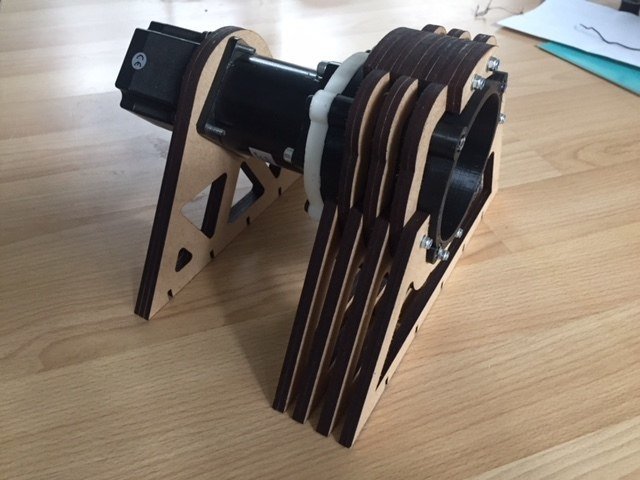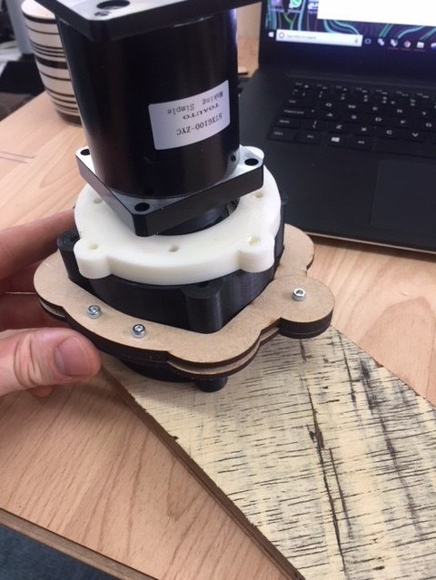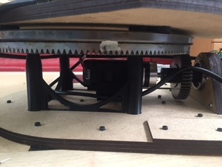 I combined these with a 'lazy susan' (the mechanism often found in the middle of tables at chinese restaurants) bearing and a 3D printed/laser cut platform to hold it up. This initial axis was controlled by a NEMA 17 and 1:42 planetary gear.