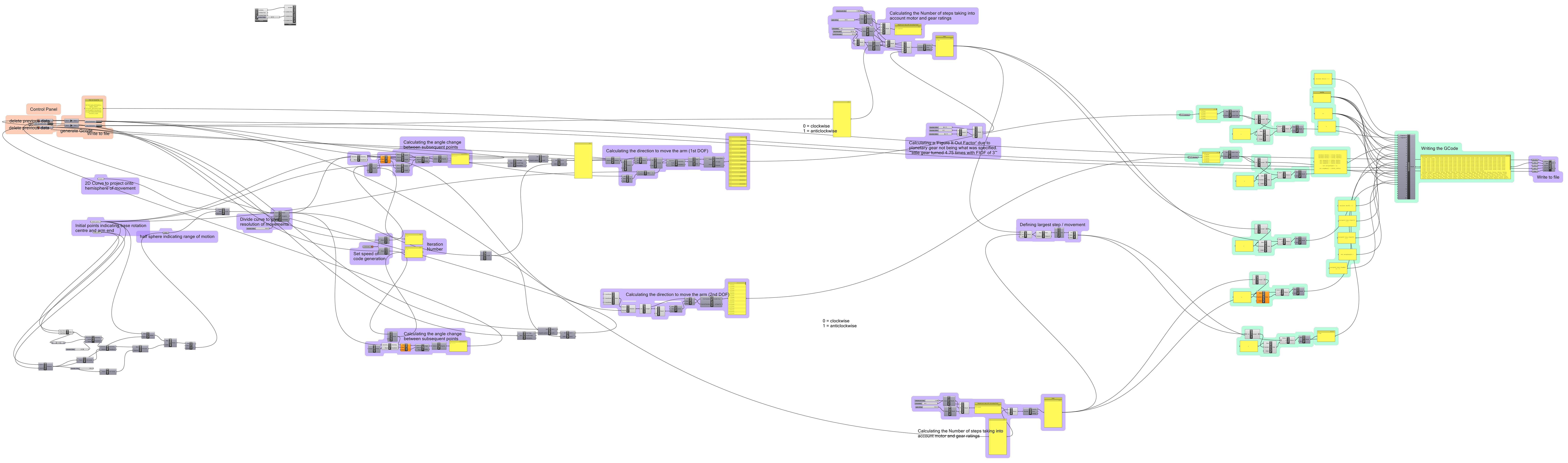 I used Grasshopper to take the specifications of the gremoetry I was using and use inverse kinematics to describe the movement of my 2 axis.