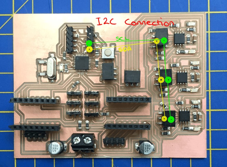 I am using I2C communication for the stop switches. In this way I could have up to 128 stop switches using just two pins ( a little over the top), but the pin saving is tremendous for the 6 I will eventually need. For this I connected the SDA and SCL pins of the AT-Mega 328-P to the same on an AT Tiny85. The 85s are in turn connected to a button which changes the boolean being sent to the main board when pressed.