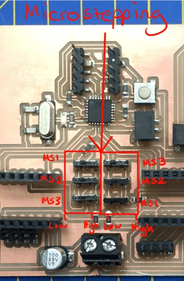 My board can achieve mircrostepping with the Pololu drivers (the top step and direction pins are for the larger tb6600 stepper driver required for the NEMA 23 - this can be interchanged with a Satstep board) using the 3 switches on the board indicating MS1, MS2 and MS3. The microstepping required can be seen in the pictures below.