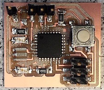 This is the first board I have produced. It is a simple board with just an LED to test programing the board, however I will be able to access the other pins used for programming. I created the footprint for the 328P AU from scratch in eagle, I took the dimensions of the feet from the data sheet which meant that the chip fit on perfectly. This made it very hard to place and solder so I will go back and increase the length of the feet. I was succesful in soldering using a combination of flux and wick to clean up the intitial soldering. Last year I used an 8MHz crystal, so I tried this again, but this time with a resonator. I am not sure why I did this initially, it appears the board that Satsha kit was was based on, Fabkit used an 8MHz resonator. If you search this FABkit document, a new board is added to the Arduino IDE, specifying the 8Mhz crystal. I enever did this, so I will try and change this. My other issue I also had last year; having just one pin on its own is very fragile, so I will need to fix this with some solder and glue. The big improvement I made on last year was creating easy connections for the ISP and FTDI connections. This makes it much easier and to setup and program the board, not having mistakes with connections.