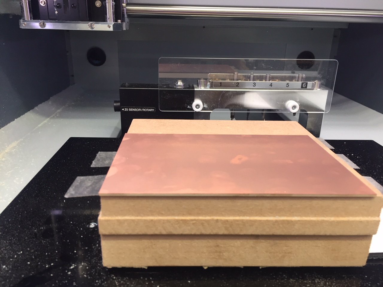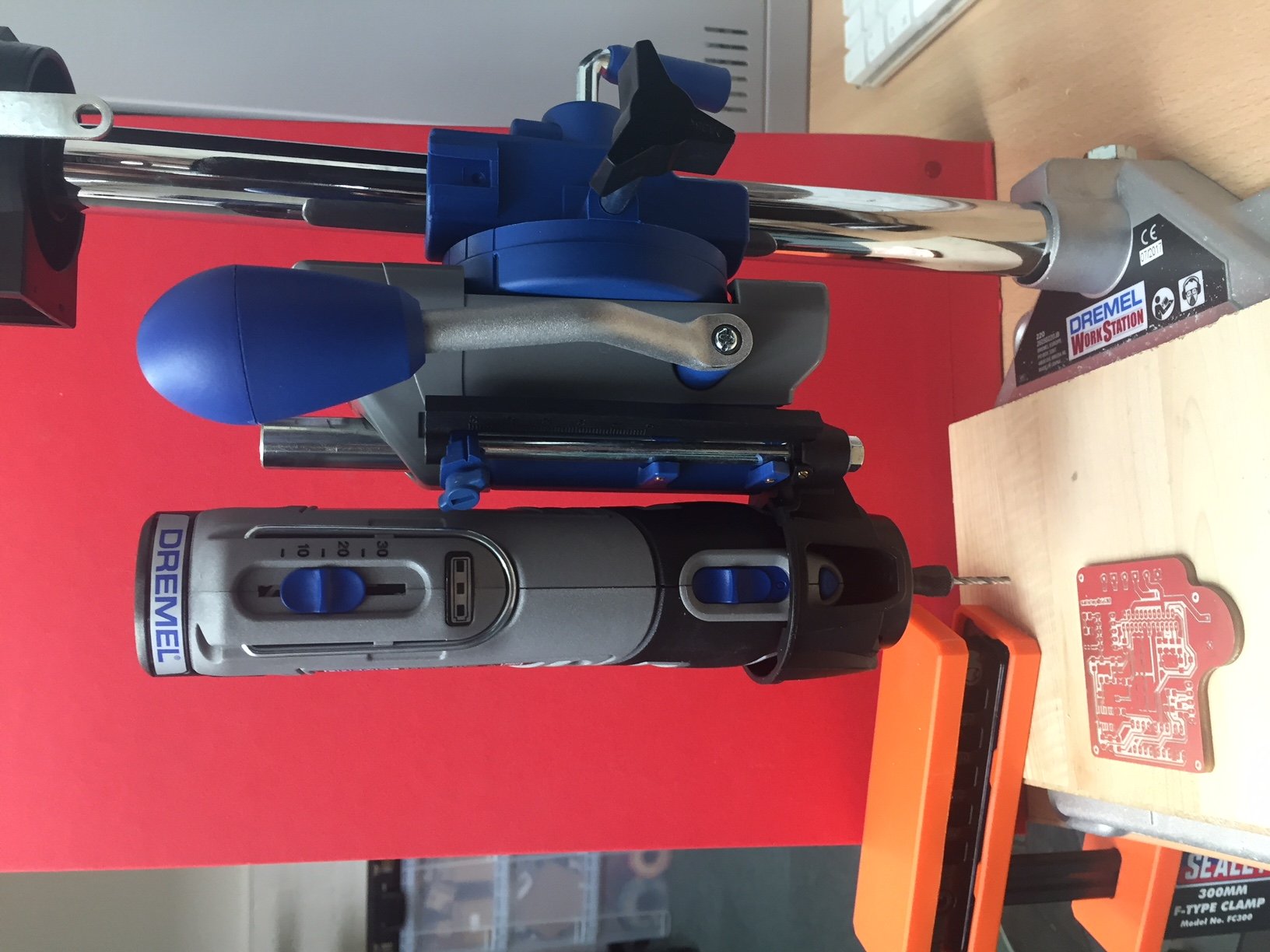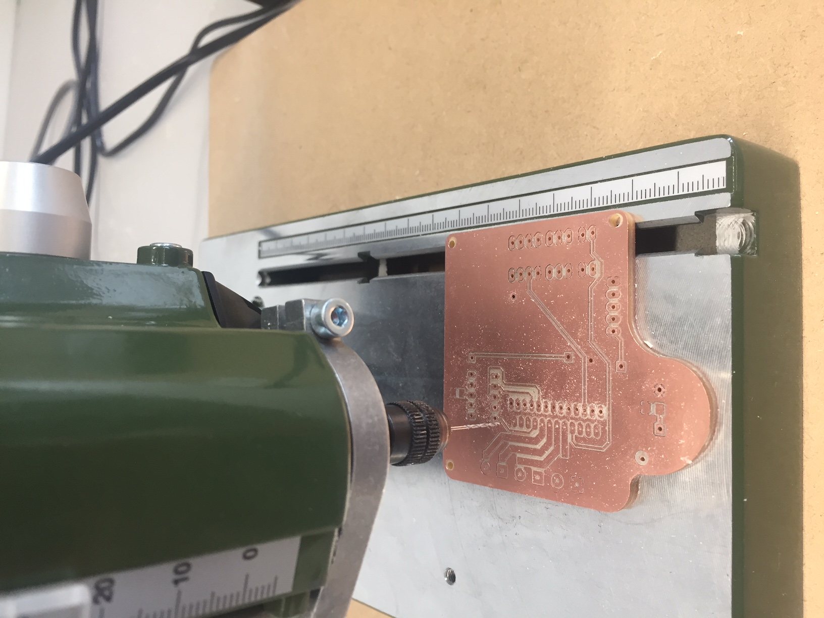 We have a Dremel in the lab with a pillar drill attachment. It looked as though it vibrated a lot and the hole on the other side was slightly offset - I though - due to excessive vibration. I was wrong however and I found that I had simply mis-alinged the two boards when sticking them together. In future I will create a file to mill out these larger outer holes and use these to align the two boards together. Unfortunately we only had the collet available for the Dremel to mill these larger holes which I used a 2.8mm drill bit for.