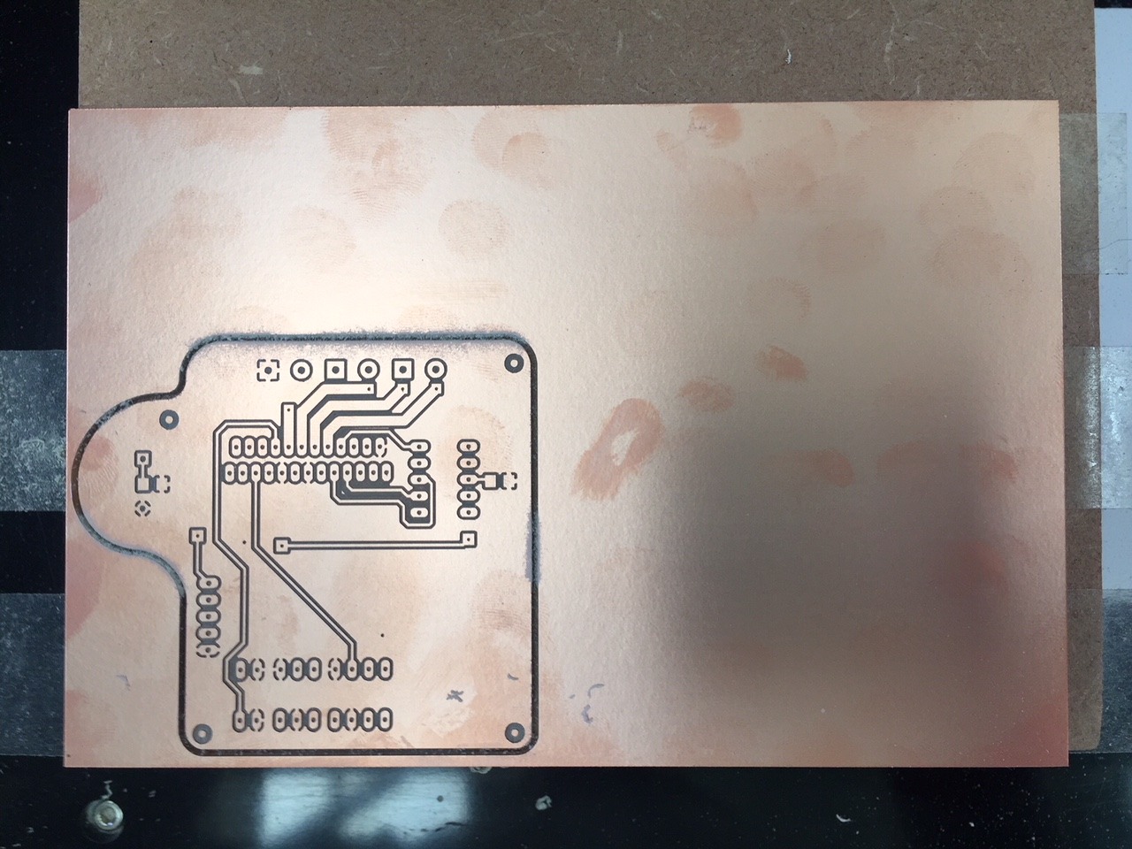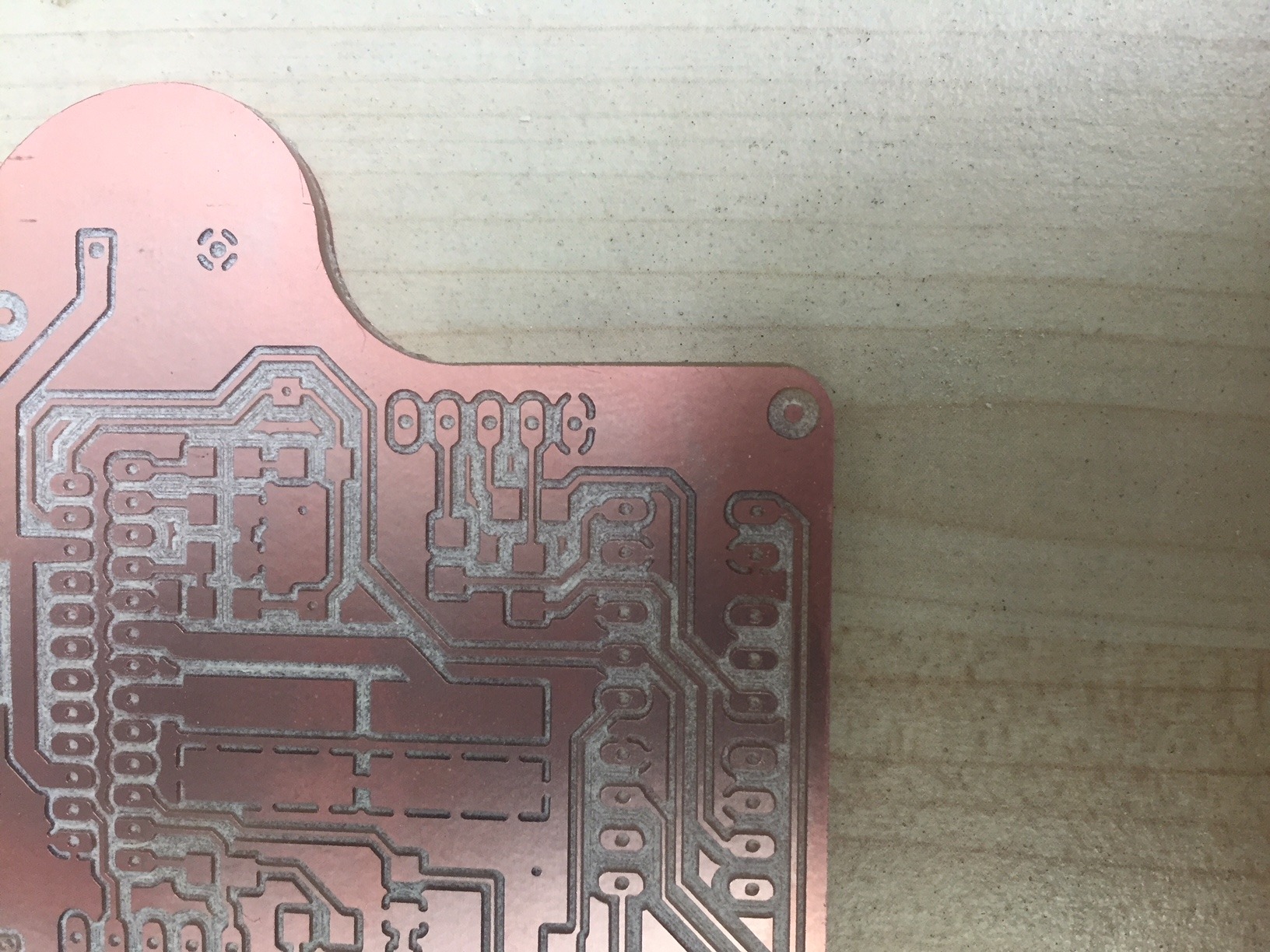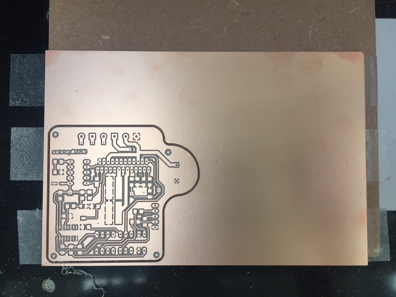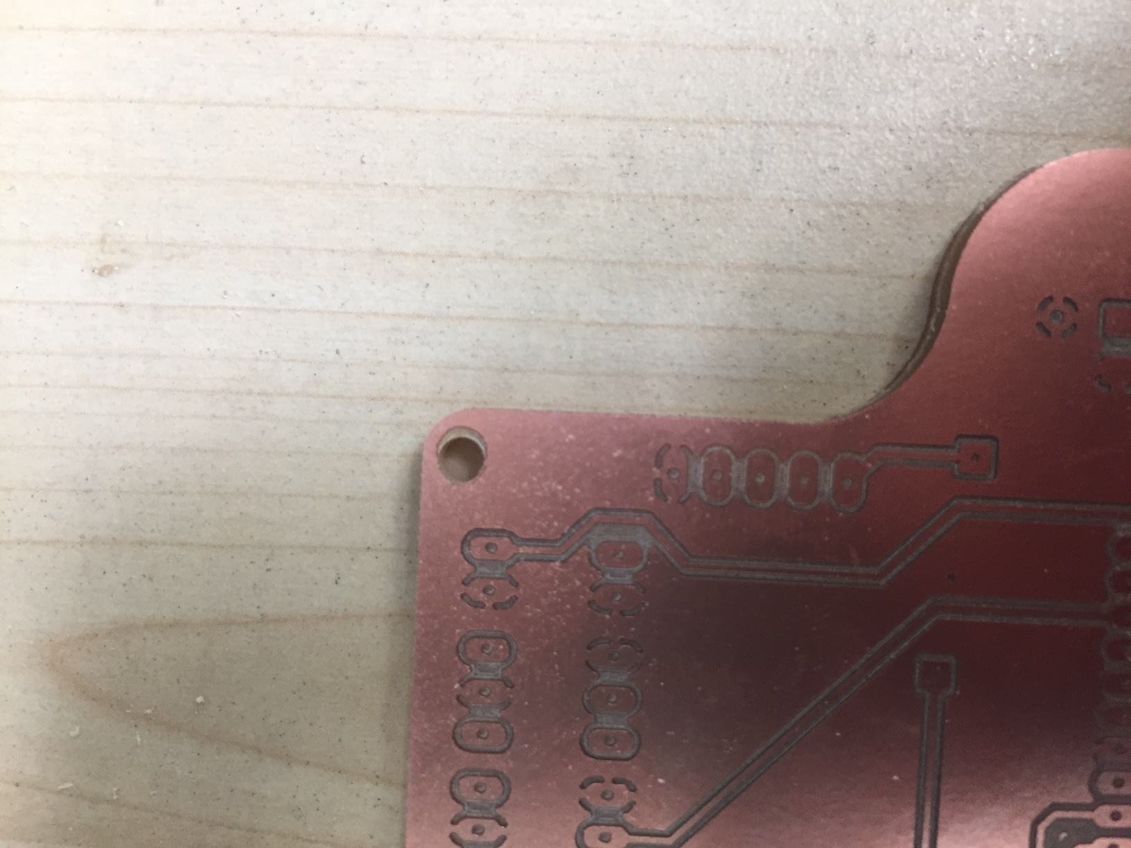 We have a Dremel in the lab with a pillar drill attachment. It looked as though it vibrated a lot and the hole on the other side was slightly offset - I though - due to excessive vibration. I was wrong however and I found that I had simply mis-alinged the two boards when sticking them together. In future I will create a file to mill out these larger outer holes and use these to align the two boards together. Unfortunately we only had the collet available for the Dremel to mill these larger holes which I used a 2.8mm drill bit for.