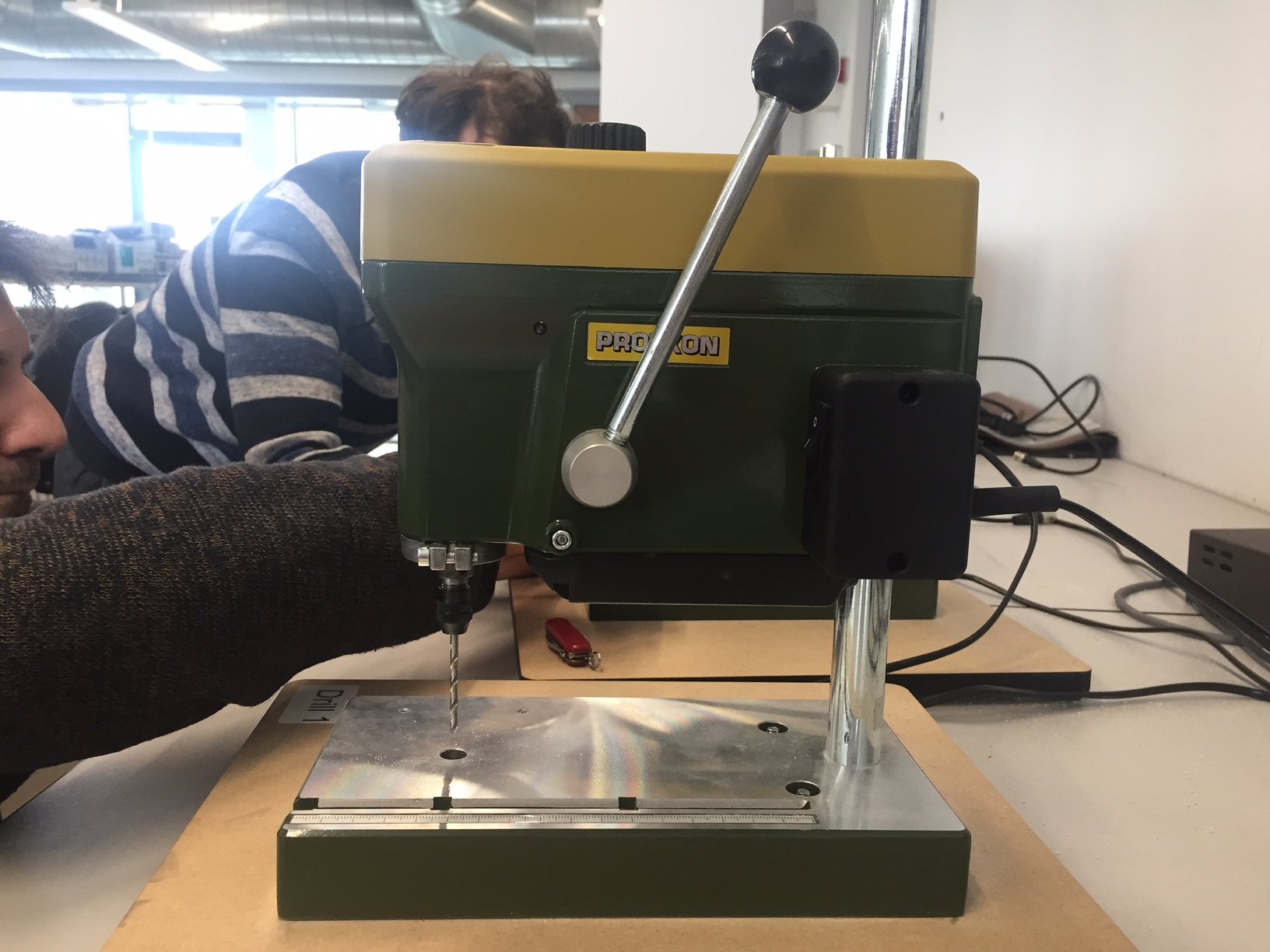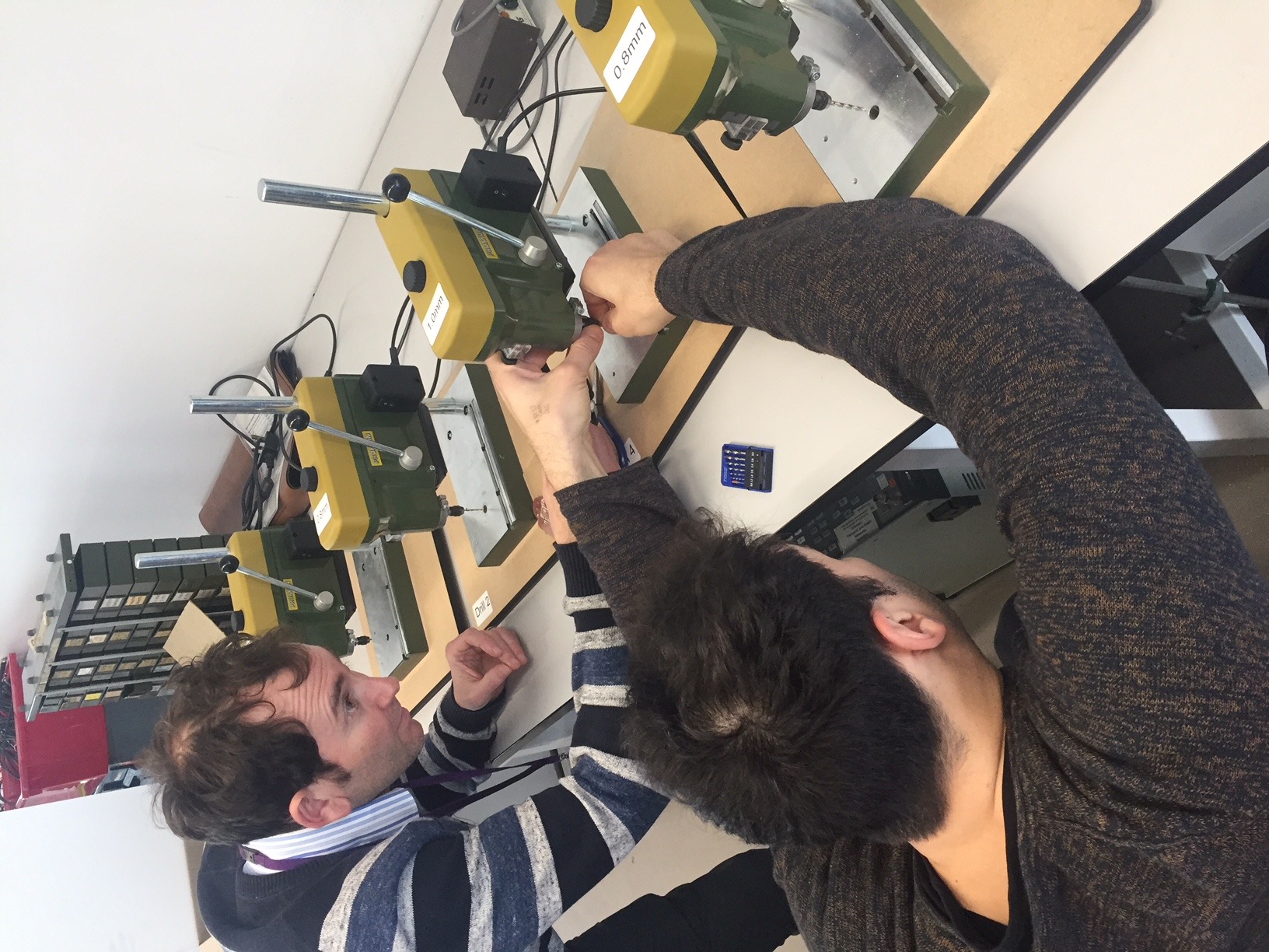 Fortunately we are located in a well equipped university and one of the electronics labs had these excellent Proxxon mini pillar drills. I used these to mill out my remaining holes using a 0.8mm drill bit. The misaligned boards was evident again and the holes were slightly offset on the other side to where I drilled again showing the importance of proper alignment. Luckily I don't believe this will cause issues, but with future boards I will not take the risk. I am also going to use a 1.2mm drill bit to drill out the large cable connector holes