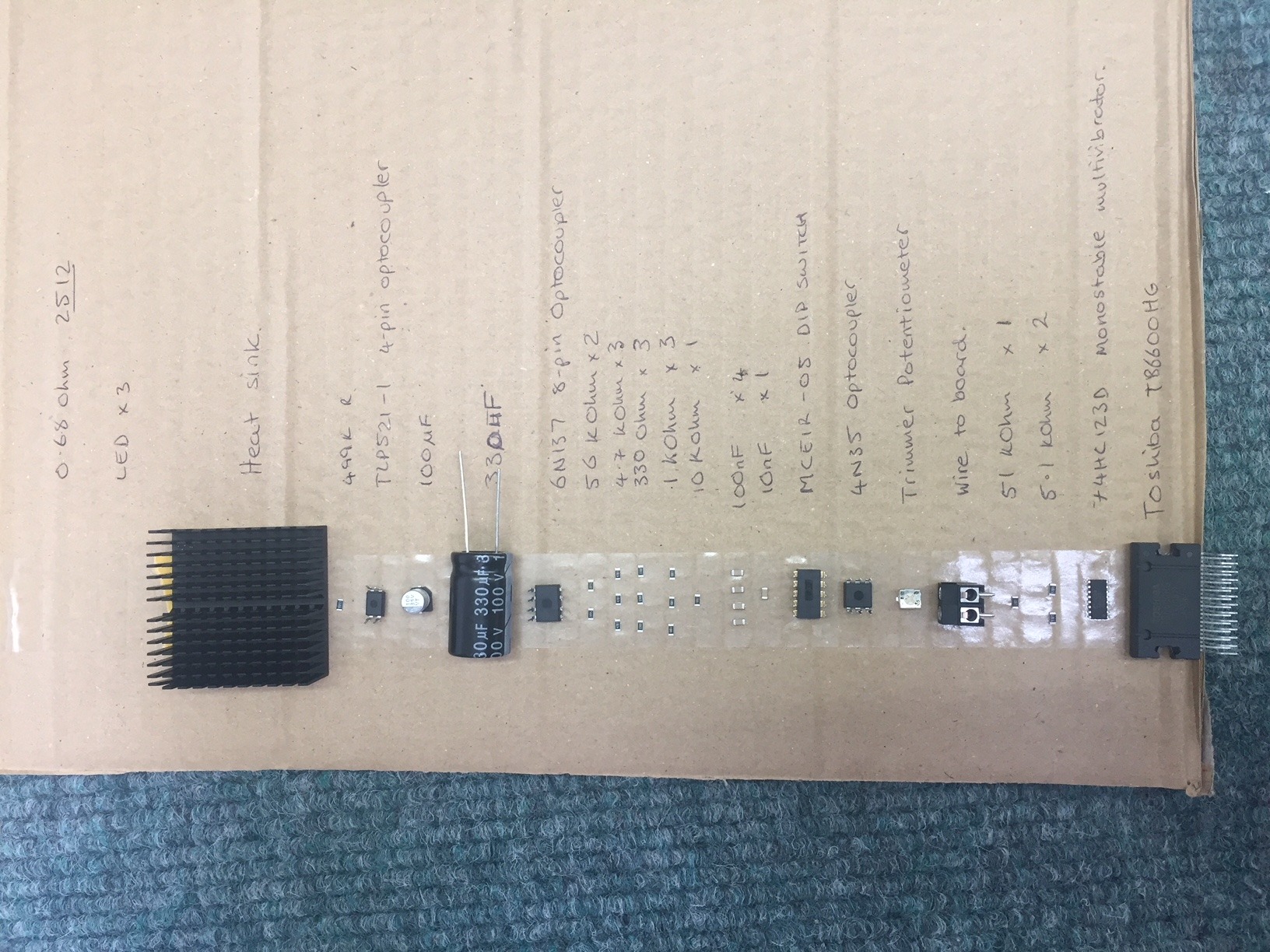 components fit perfectly through the 0.8mm holes and there didn't seem nearly as I thought there would be. I bought these components well in advance as I knew I wanted to make this, unfortunately I have forgoten the 0.68Ohm 2512 package capacitors so I will have to wait for these to arrive before the board is finished.
