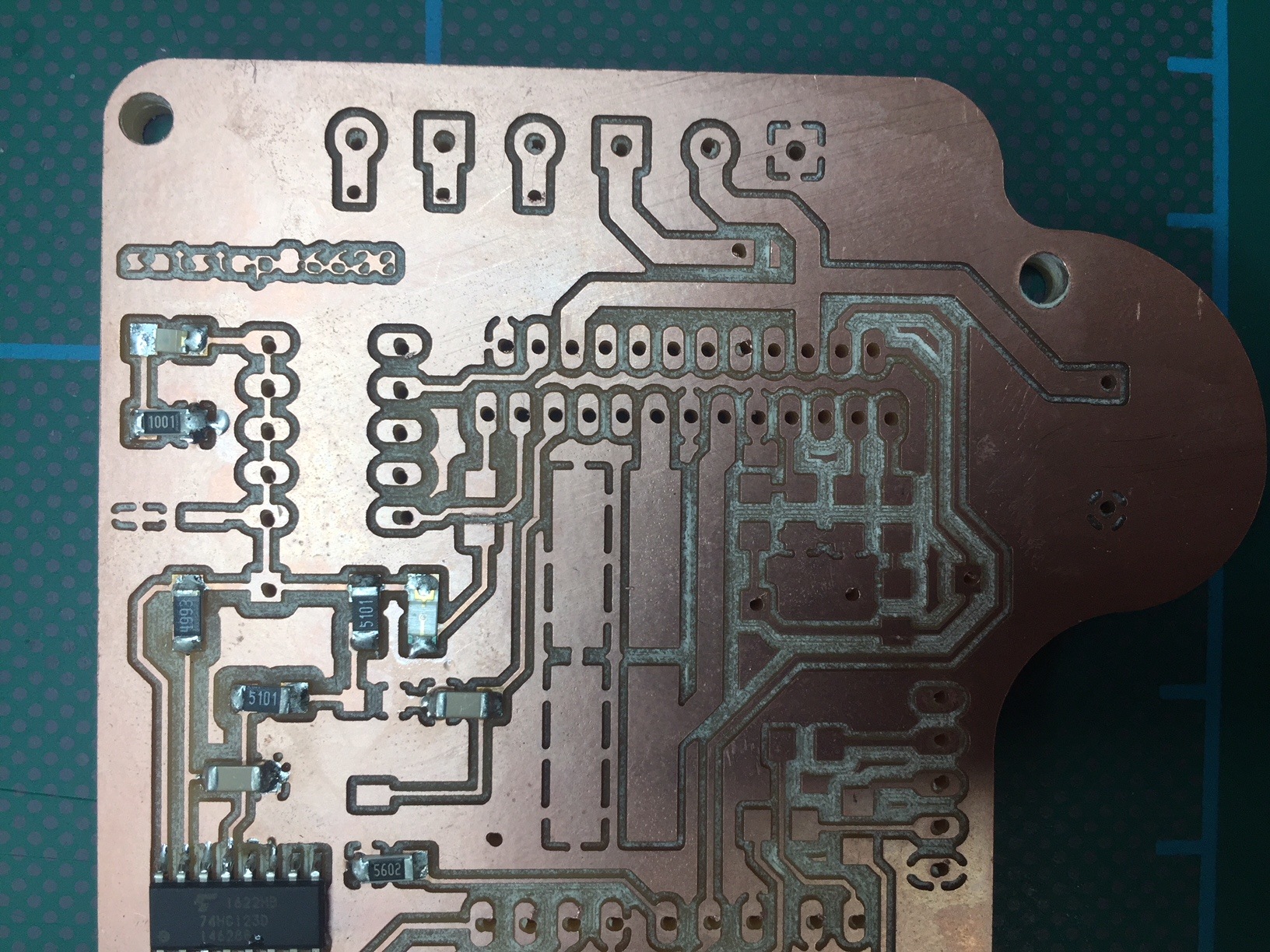 The next challenge was milling the Toshiba chip. One issue is the heat dissipation capabilities of this chip meaning it was difficult to heat the pins up enough to bond the solder to them. My other challenge was the two rows of pins - getting to the ones at the back was very difficult with the tip I was using; this combined with the heat dissipation concluded in a bit of a mess.