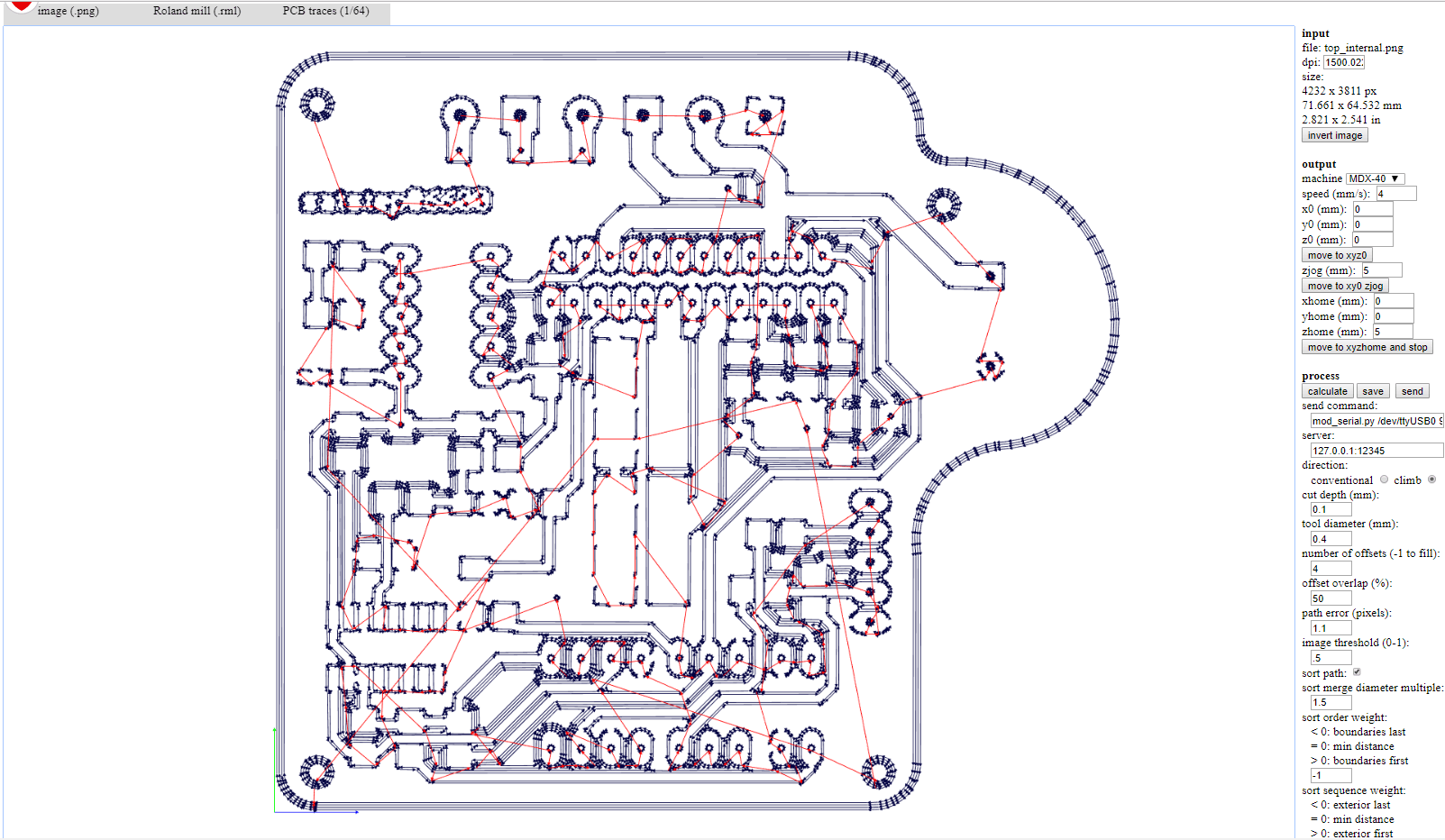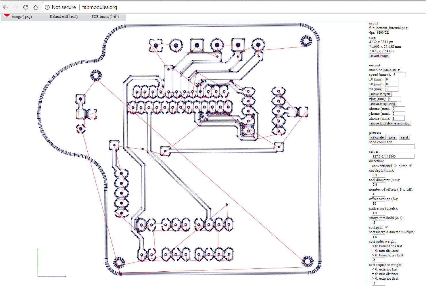 I downloaded Danieles files from his github page which includes a bill of materials the eagle files and the .png's required to mill the board using 0.1 and 0.4mm bits. I am going to use the 0.4mm traces.