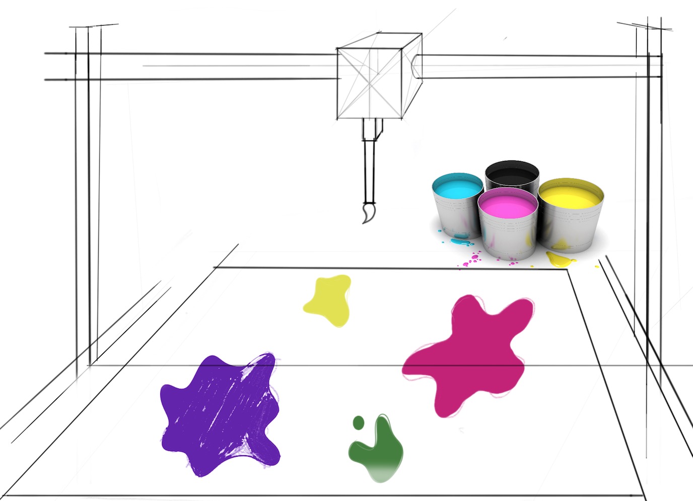 This machine would work in that it holds a brush. When a note is played say on a midi keyboard, this information is translated in terms of time and frequency of the note, as well as its duration, onto a big sheet of paper set on the floor. The machine looks at these factors and translates them onto the paper in whichever assigned color the frequencies corresponds to. A few pots of paint will lay next to the machine that it can reach, as well as one filled with water so the brush can get semi cleaned when switching colors. It would have the capability to move x,y,z. This would enable it to move to the pots of paint and dip the brush in and out of the paint. The x,y and z coordinates would exsist on the brush holder as well as the bit moving the brush and the holder itself. In a sense, it would sort of function as an extreme version of a polargraph. All in all this would be an interactive installation.