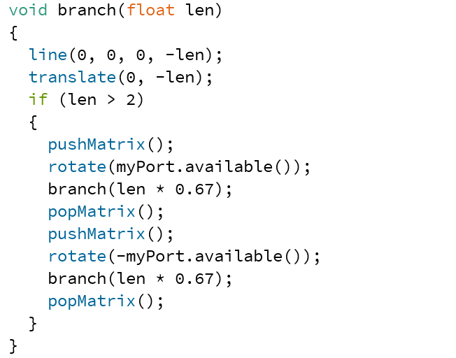What I learnt here was that by decreaing the value length is greater than, the more branches are printed. And increasing produces more making a more "naked" tree. I thought that was very interesting.