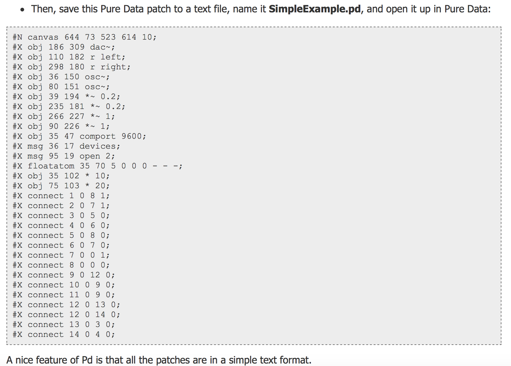 When I copied and pasted this into TextEdit on my Mac, I refused to left me save it as a pde doc, insisting it had to be .rtf (rich text file). My alternative was to save it as pde.rtf. I tried to both open the file like that on PD and also later remove the .rtf bit afterwards, but PD was unable to read or identify the file. Instead I got error messages in the PD window.