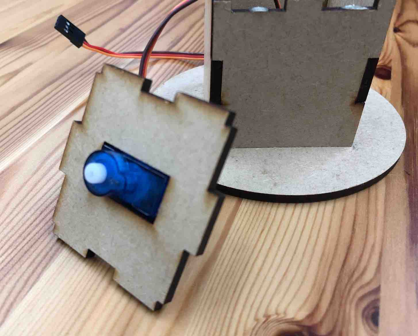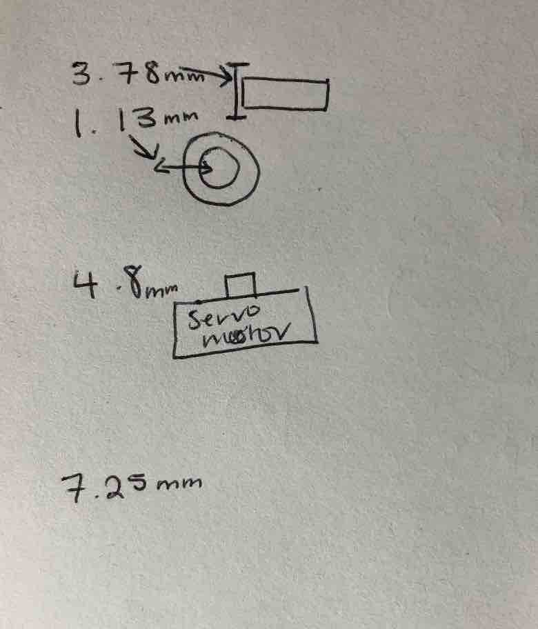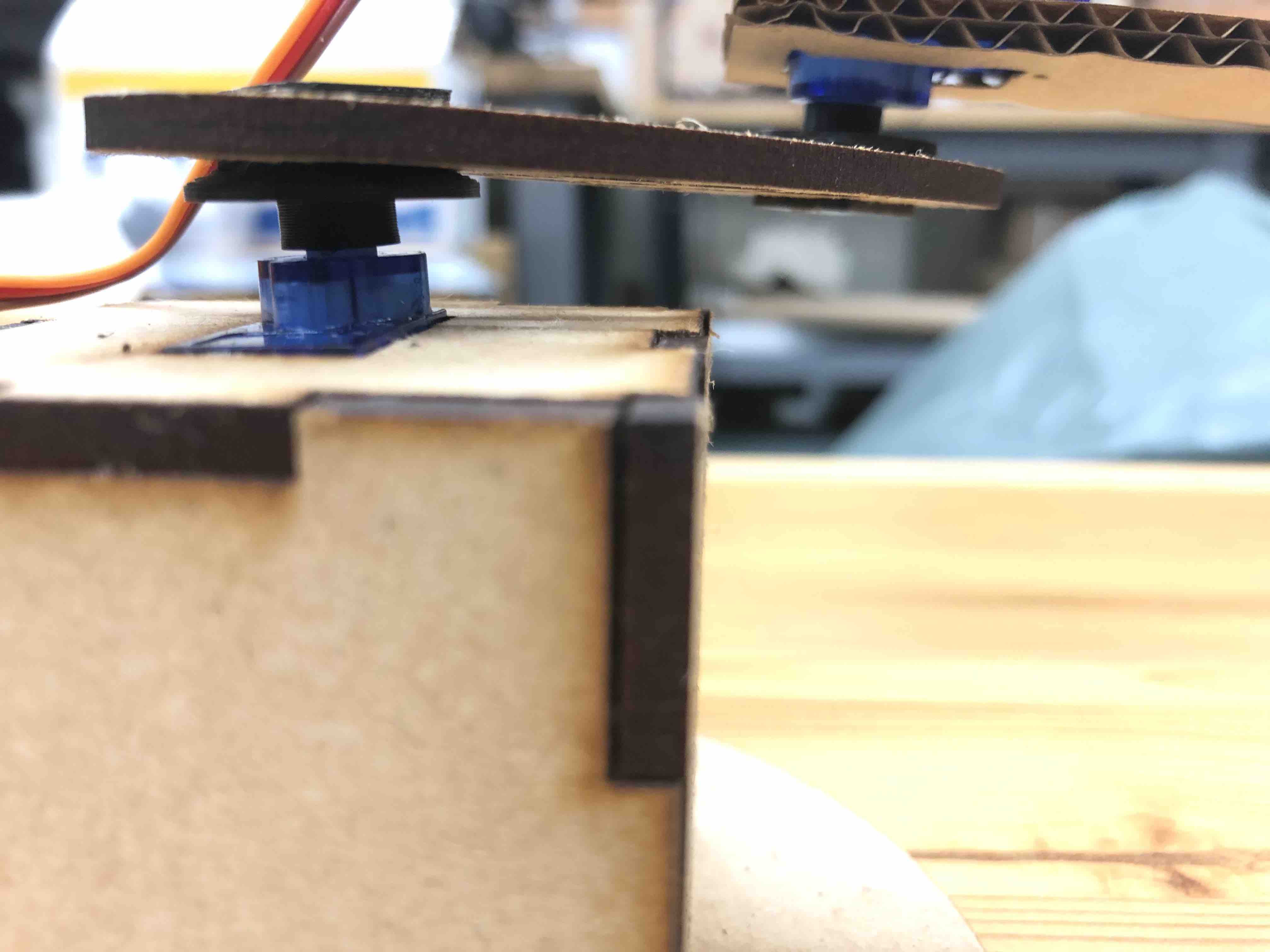 The next step was to fit it all together to see what was the best way to get the servo on there as well. This was a bit of a challenge because of the wires at the bottom, and the lack of a tall neck at the top. I also had issues because I was unsure of how to laser cut the sort of top heavy bottom light 8 shape the servo head had. I was hoping to create a pole using 3D printing to elongate the space, but I simply could not figure out how to measure the hole on the attachment end and the servo end, and then the rivets too. But I soon realized by placing my servo in the same space as the sharpie that I could just change the shape to a circle and place it on that way.