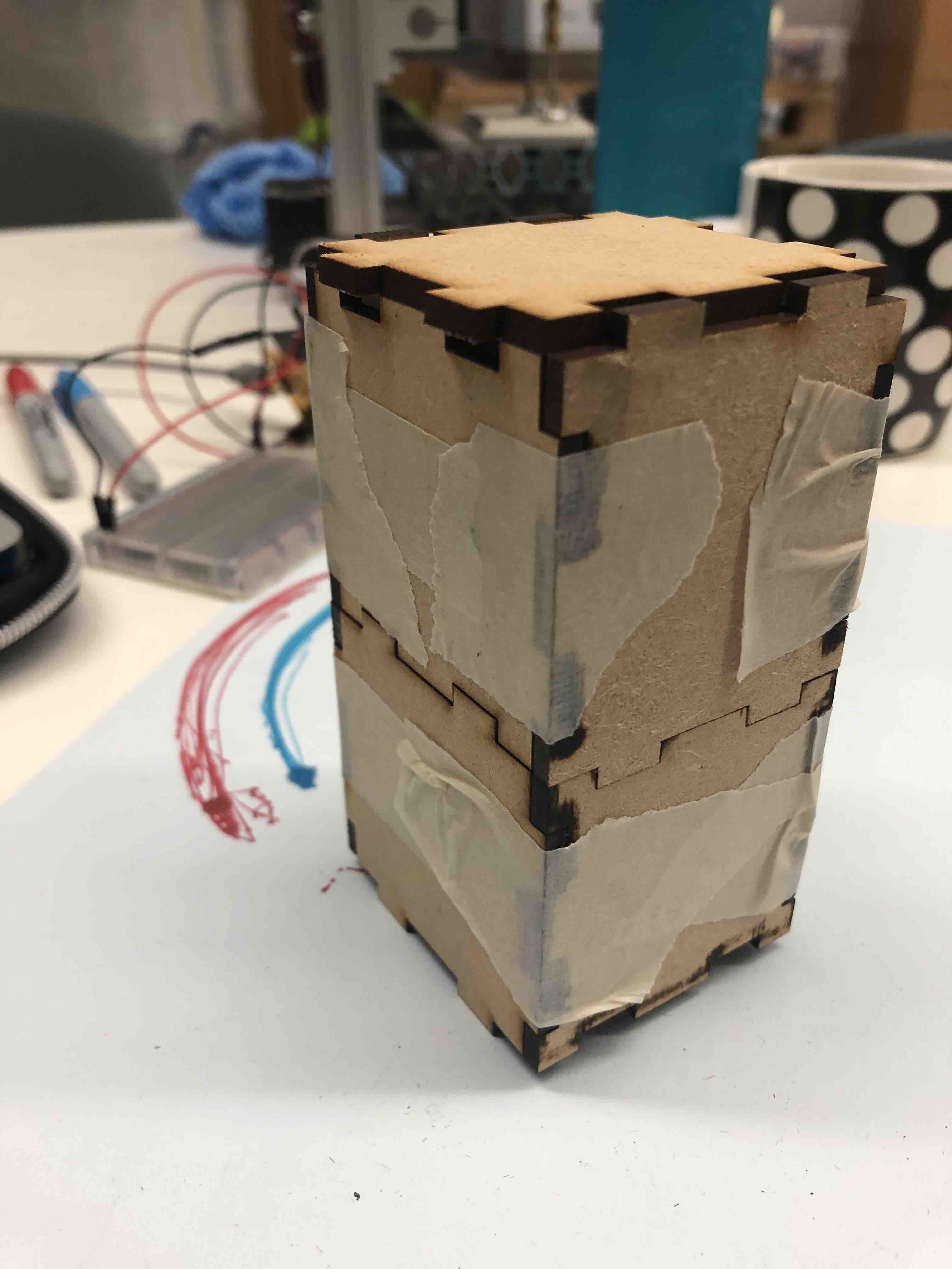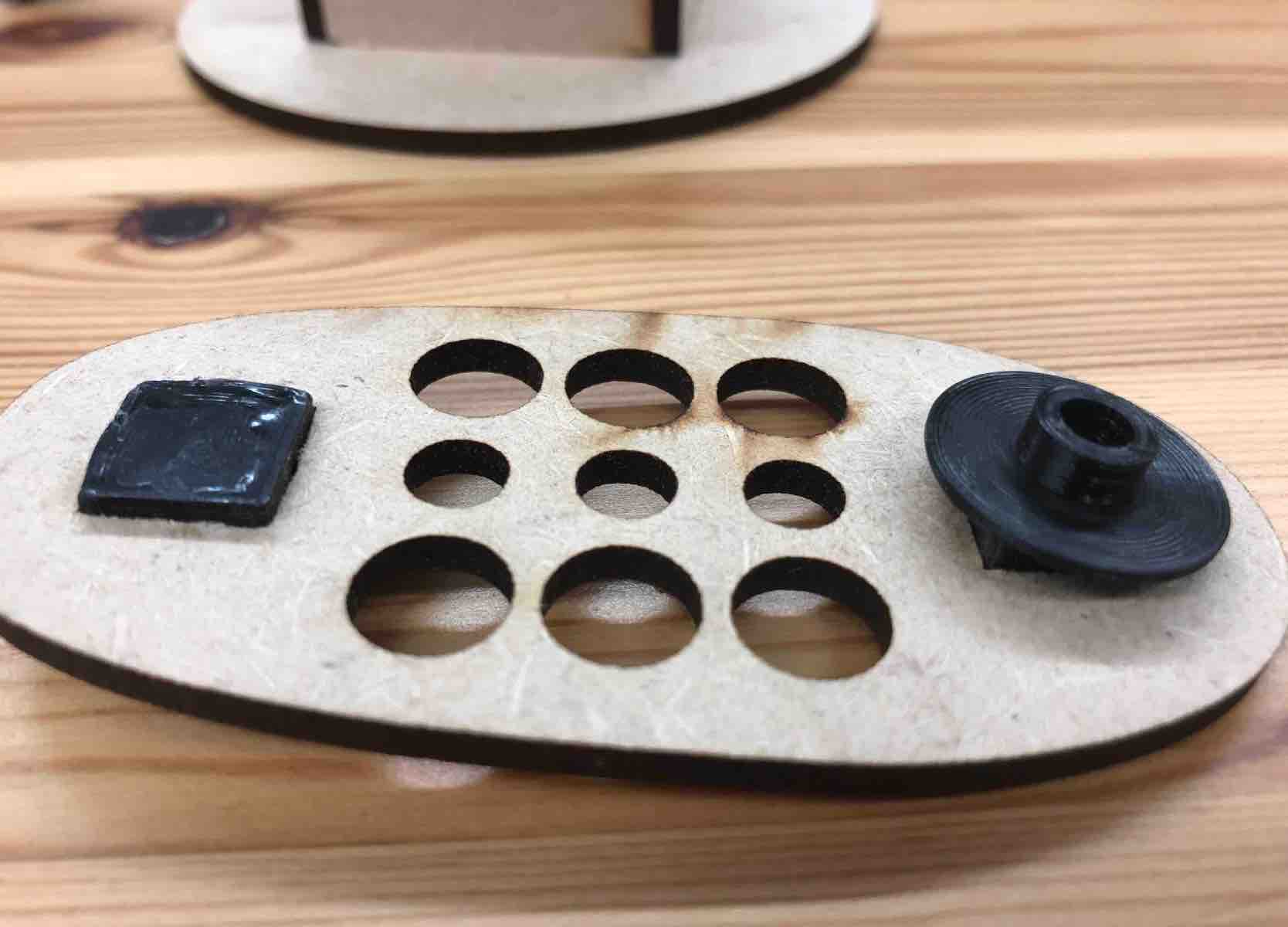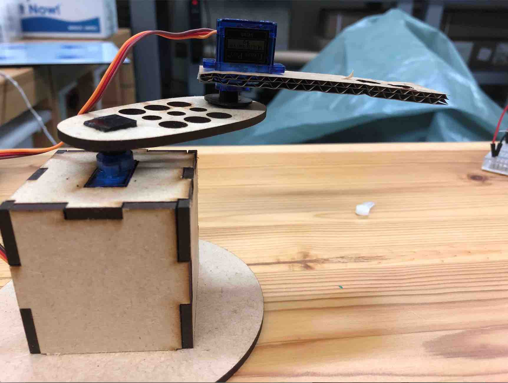The next step was to fit it all together to see what was the best way to get the servo on there as well. This was a bit of a challenge because of the wires at the bottom, and the lack of a tall neck at the top. I also had issues because I was unsure of how to laser cut the sort of top heavy bottom light 8 shape the servo head had. I was hoping to create a pole using 3D printing to elongate the space, but I simply could not figure out how to measure the hole on the attachment end and the servo end, and then the rivets too. But I soon realized by placing my servo in the same space as the sharpie that I could just change the shape to a circle and place it on that way.