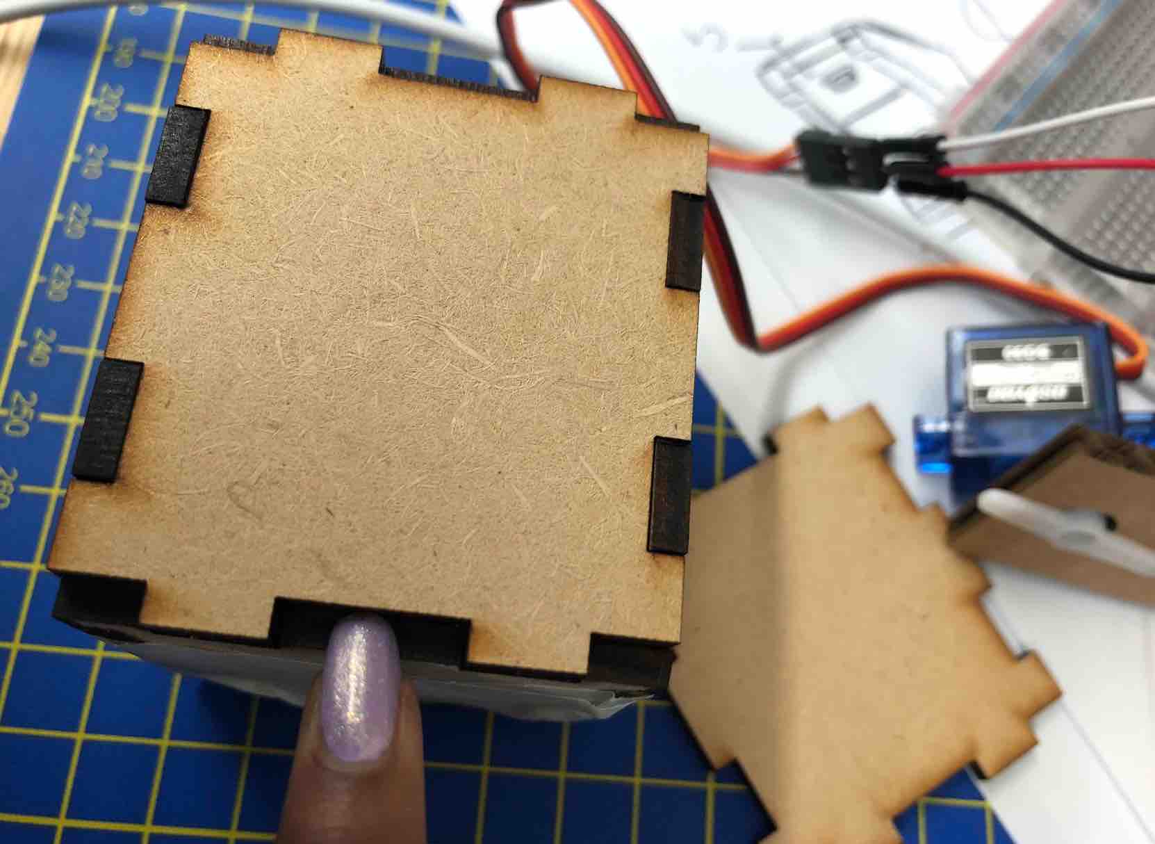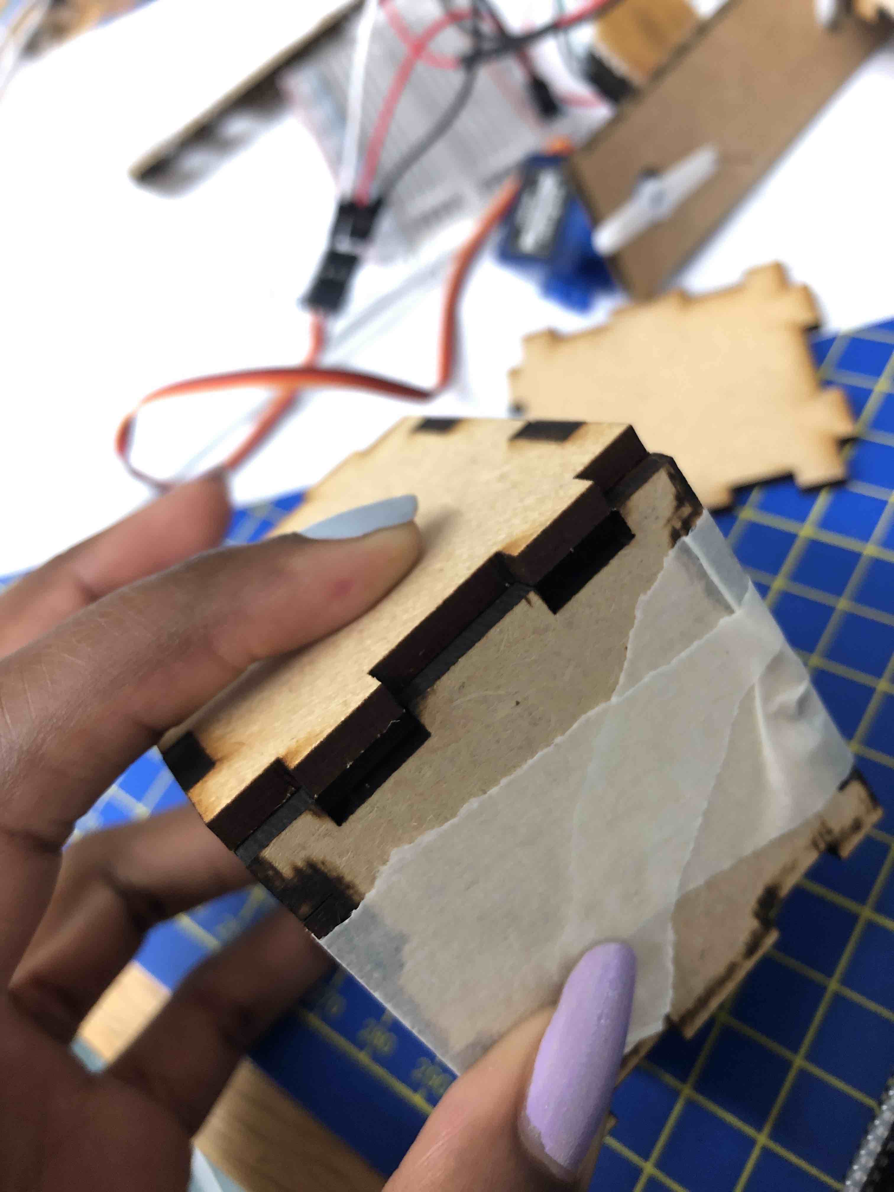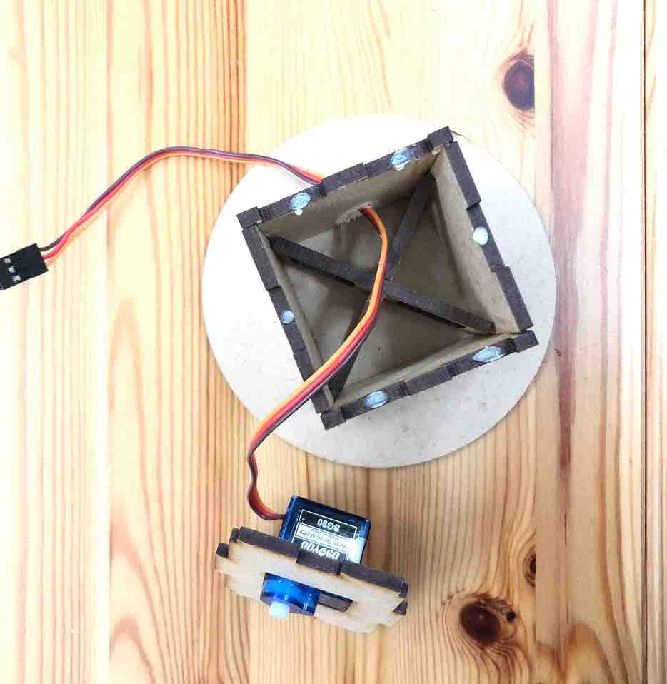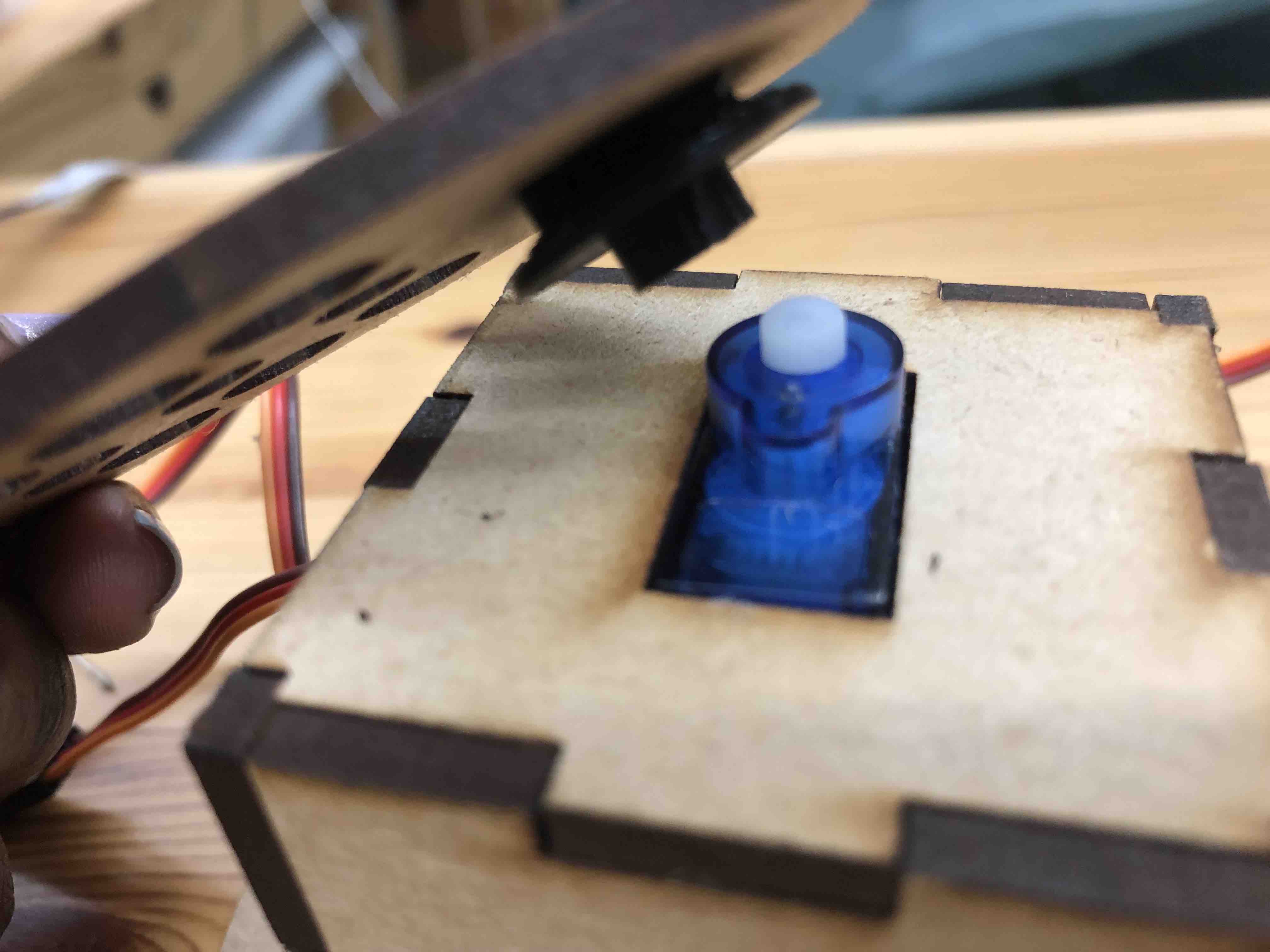 I also opted to rid the arm that comes with the servo and 3D printed my on servo heads to use. And we made a servo box to put all the circuit wires and boards inside...