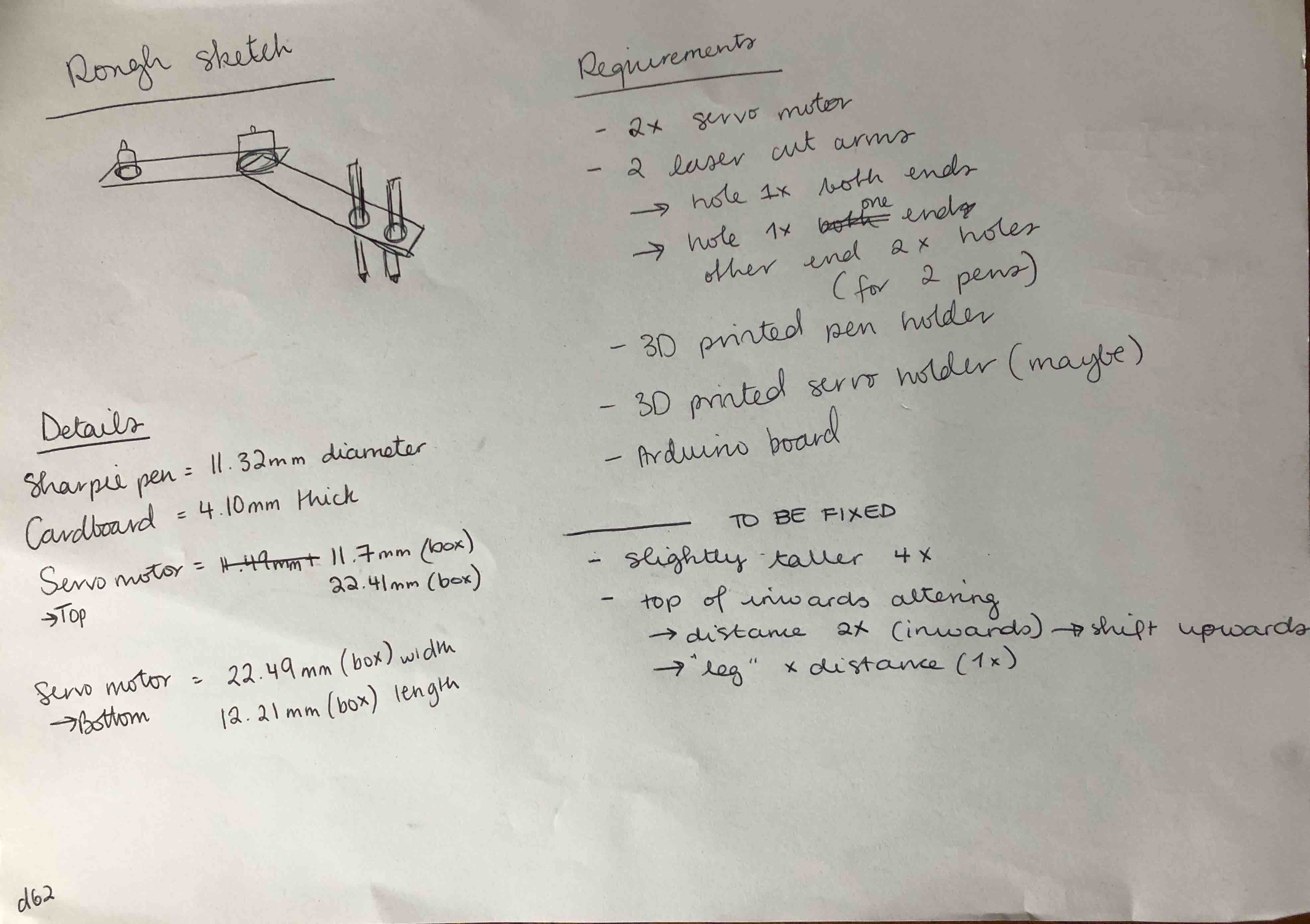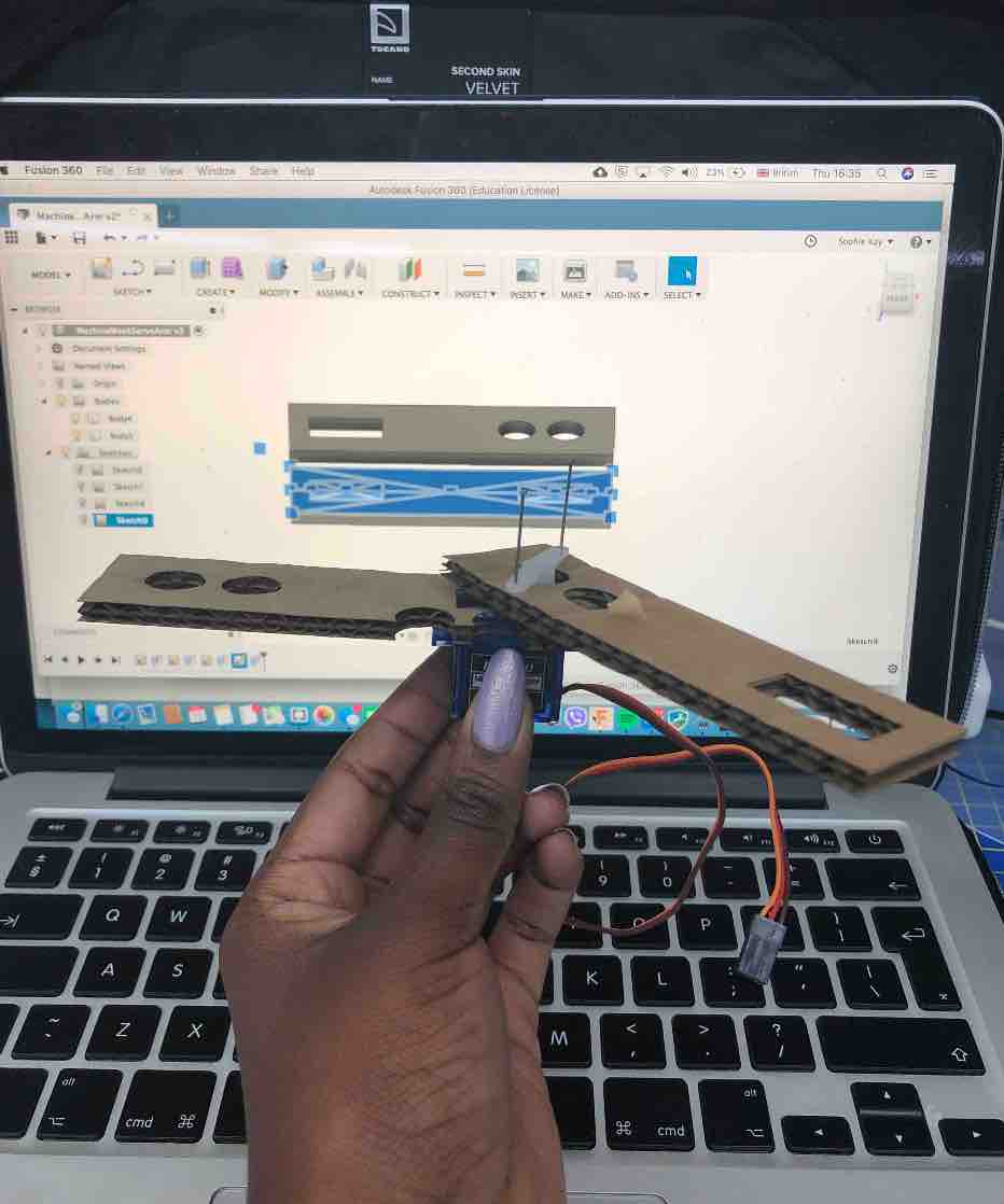 After noting them all down I took to fusion to first get the arms. Initially I was to use MDF, but after speaking to Kyle, we realized that his servo motor would most likely be incapable of holding it all up. So I figured, what would be sturdy, but super light? CARBOARD! Also super easy to cut I might add. And once I am done, if I do not wise to hold onto my minature machine, I could throw the carboard away and it would be recylced! :) everyone wins.