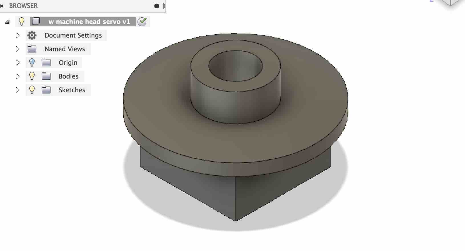 The idea was to replace the arms that come with the servo head because they were in the way, not truly needed and not exactly visually pleasing when looking at the machine as a whole. It needed to have a part to sit on teh servo head, something to stop it from moving (this is the flat circular bit) and something to help fit it through the hole (the box shape).