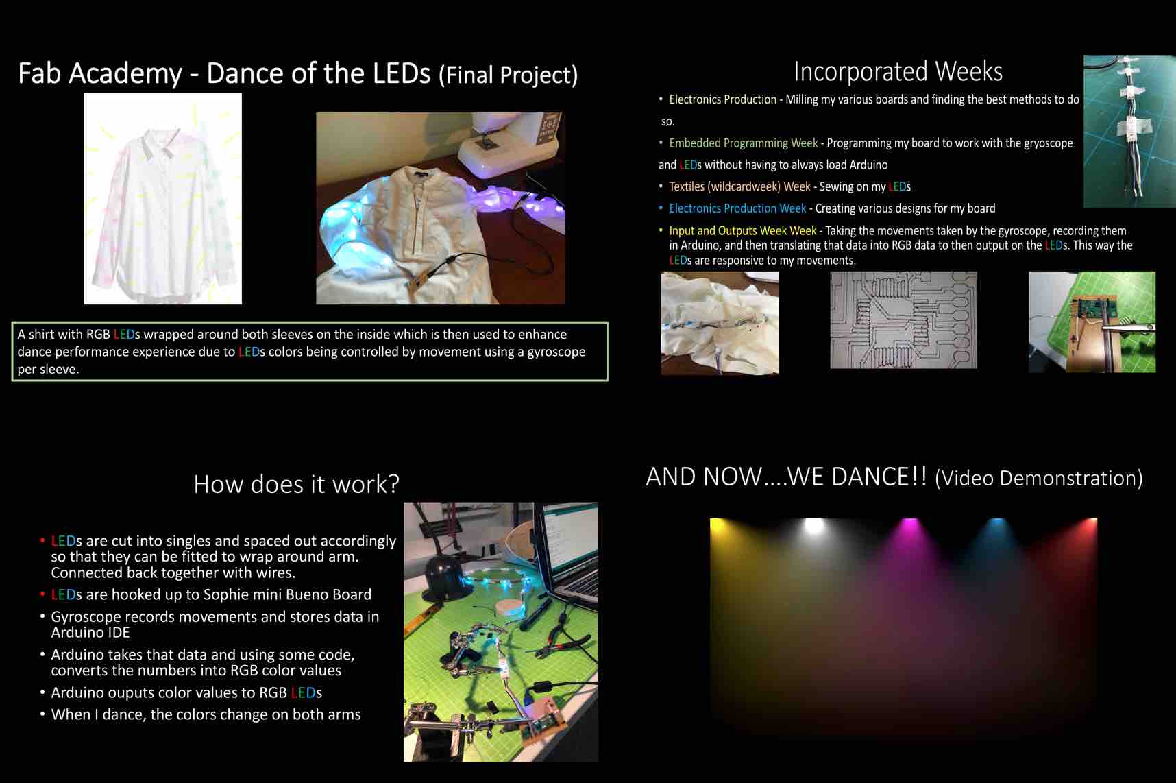 My final project is "Dance of the LEDs. It will be a Shirt with LEDs that I shall dance in. It is something intended for my personal use, with potential to grow into a marketable product sold to dancers of all sort of genres. I don't mind other's taking the project and expanding on it but would love to hear about developments as that's the best way to grow after all.
