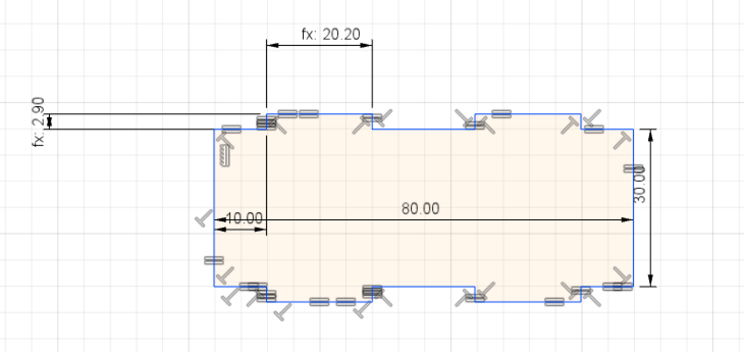 I made a new sketch within the same one as my comb so that I had to details and figures at hand easily. I created a rectangle with 2 outer slots on each side. Knowing that I could get my sides the same not only by using a list of parametic sizes, but also by getting the letter title from the side, I used a combination of both skills and would later refine the parametric ones as I progressed and had decided on a size. After creating the rectangular shape, I extruded it by the width of the wood - 3.2mm