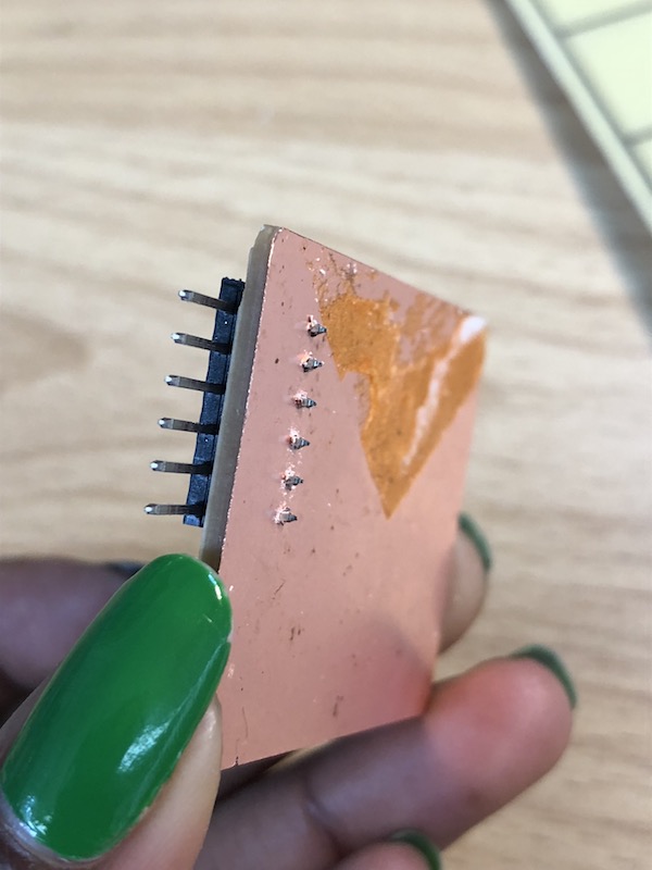 As things were running so smoothly, I decided to take a risk and instead of using my 1x6 SMD and decided to substitute it for the more "longer life" right angle through 1x36 Header Male (which I cut to have 6 pins). It meant having to drill holes into my board which was scary because it could have easily gone wrong if I used the wrong drill or the holes didn't match up properly. What was done was drilling one hole in to test if it fits fine, then using that drilled hole, placing the bit over that hole and placing the other feet of the header pins on the other pads, taking a pointed knife, and making a small hole where they touched. This would, and did, ensure that when the other holes were drilled, that they would go into the right holes and the 6 feet would all fit in fine. It was then just a simple matter of soldering them into place. Thankfully it went well and looks fine now.