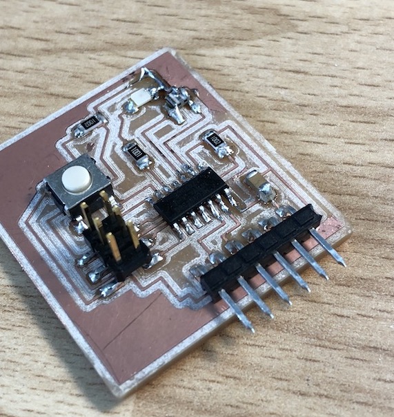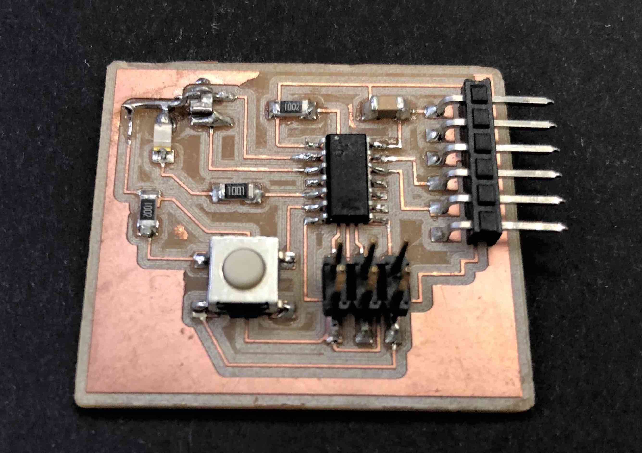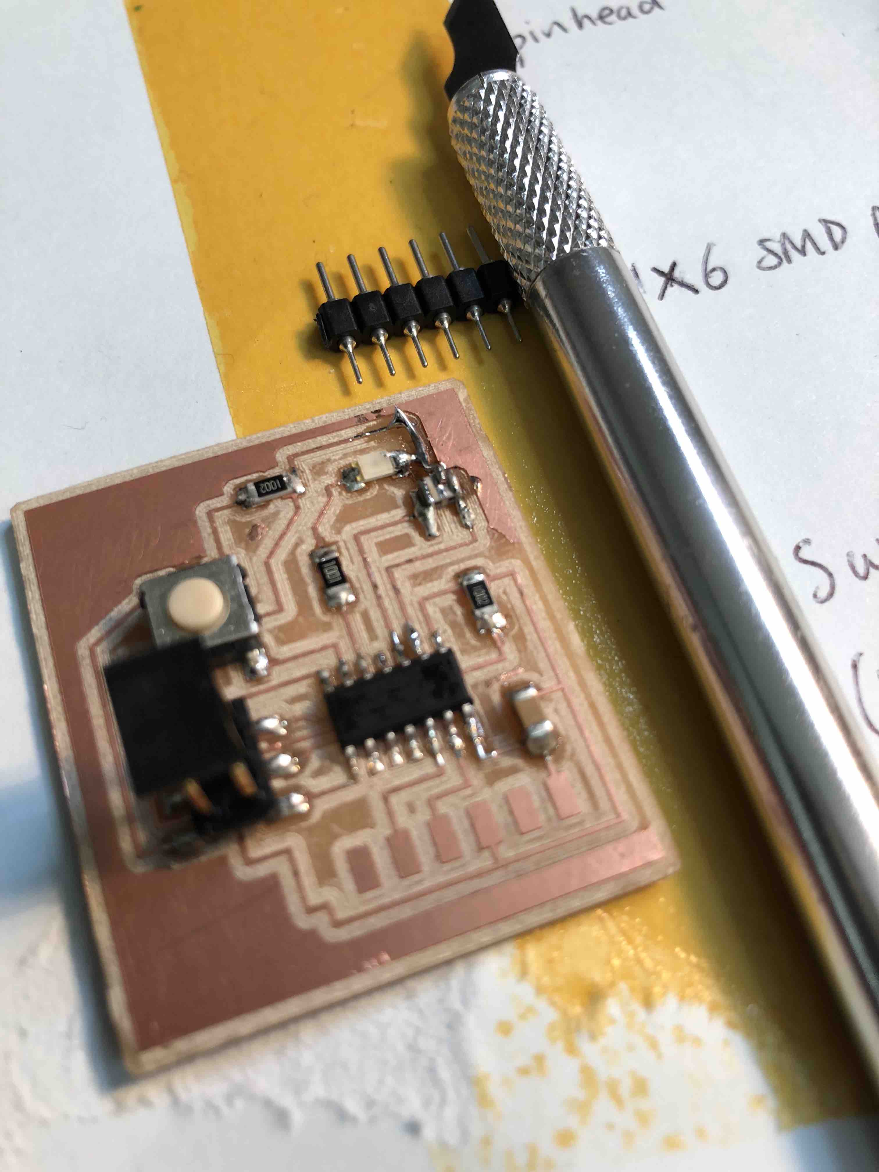 After milling, I luckily enough this time had no issues soldering. Which is great as last time it took 4 times till I got a functioning one. I did run into a minor issue with my crystal again. The problem this time was that I was not able to get the solder to reach the crystal, there was a tiny space left still. This got me to thinking; when I do my board next time and it requires a crystal, I will make the connection between the board and the cystal bigger in the center so that it is easier to solder. Because the line was so thin and getting the middle bit of the crystal is such a delicate job, even after getting help, the connection ended up burning off. Of course the simple and effective solution was to get a wire and solder it onto my board and create that connection. Thankfull it worked, and it doesn't look too terrible.