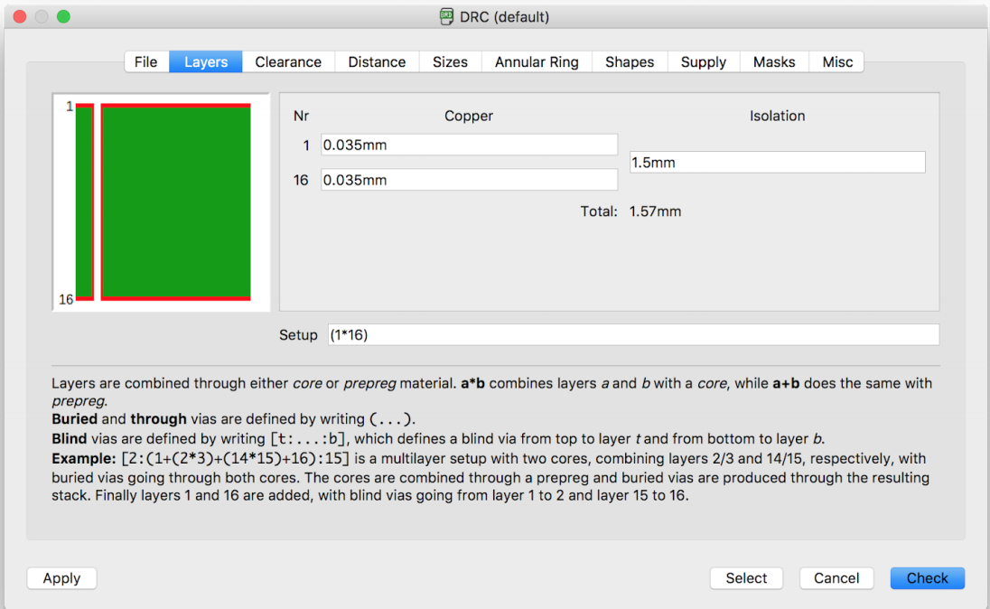 On the Board view in Eagle, open the Design rules window (Tools menu > DRC...) and set them to the following