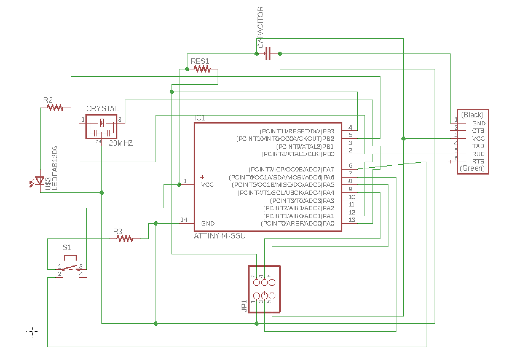 My global evaluator Bas kindly pointed out an improvement I could make which is to use the pull-up resistor internally found in the Atting44 chip instead of using its own resistor.